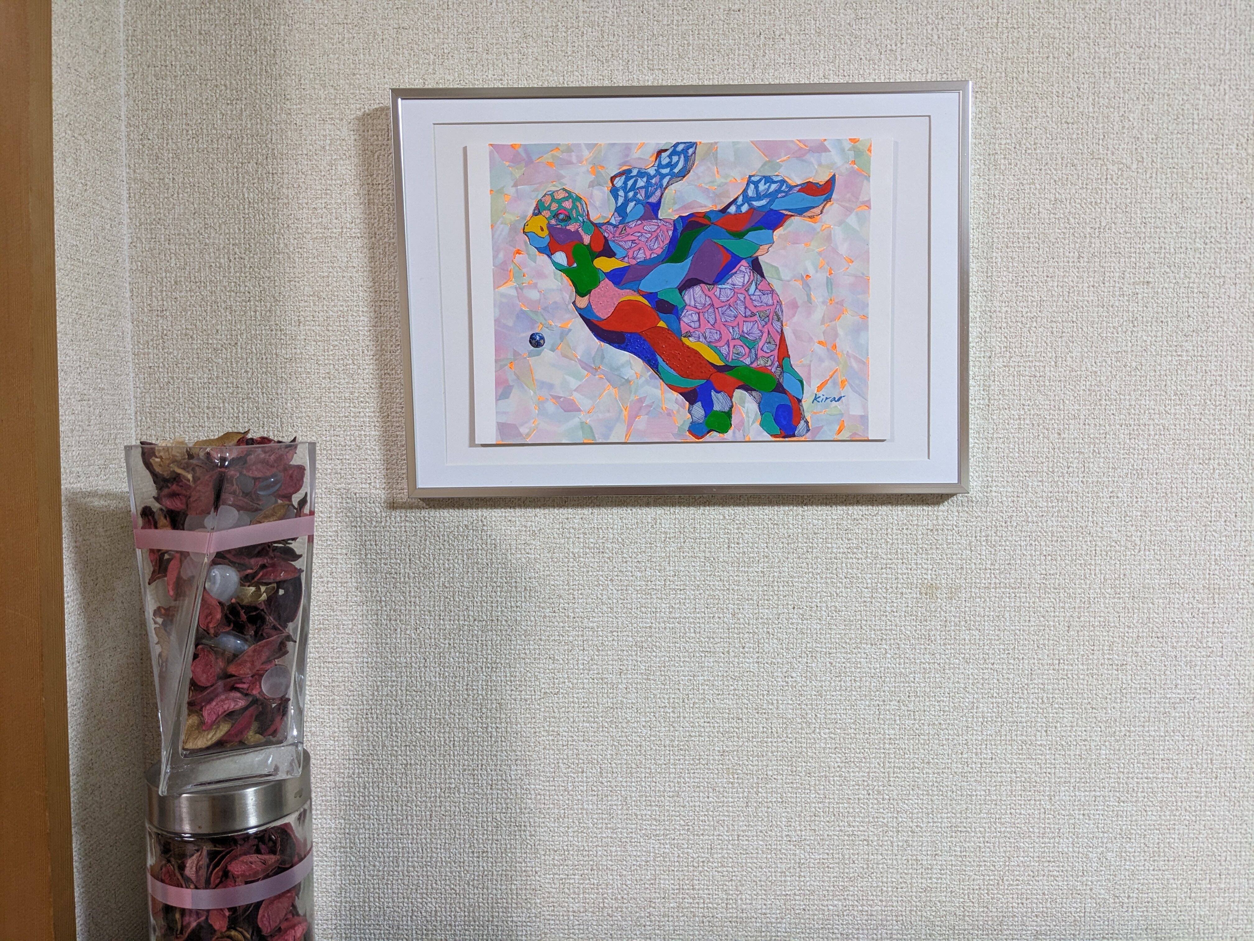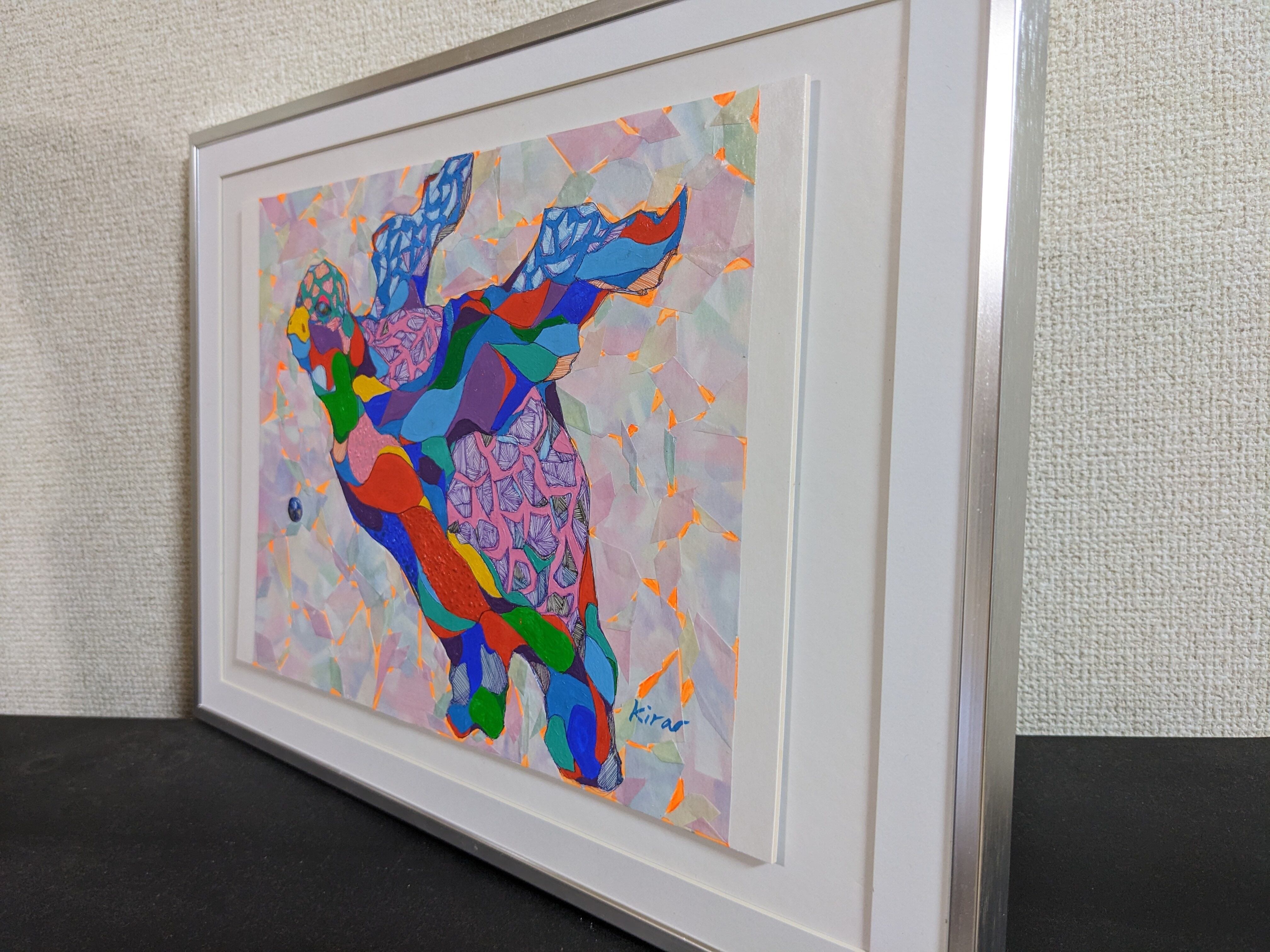 作品のサイズはA4で、オリジナル原画の一点物です。額も付いています。