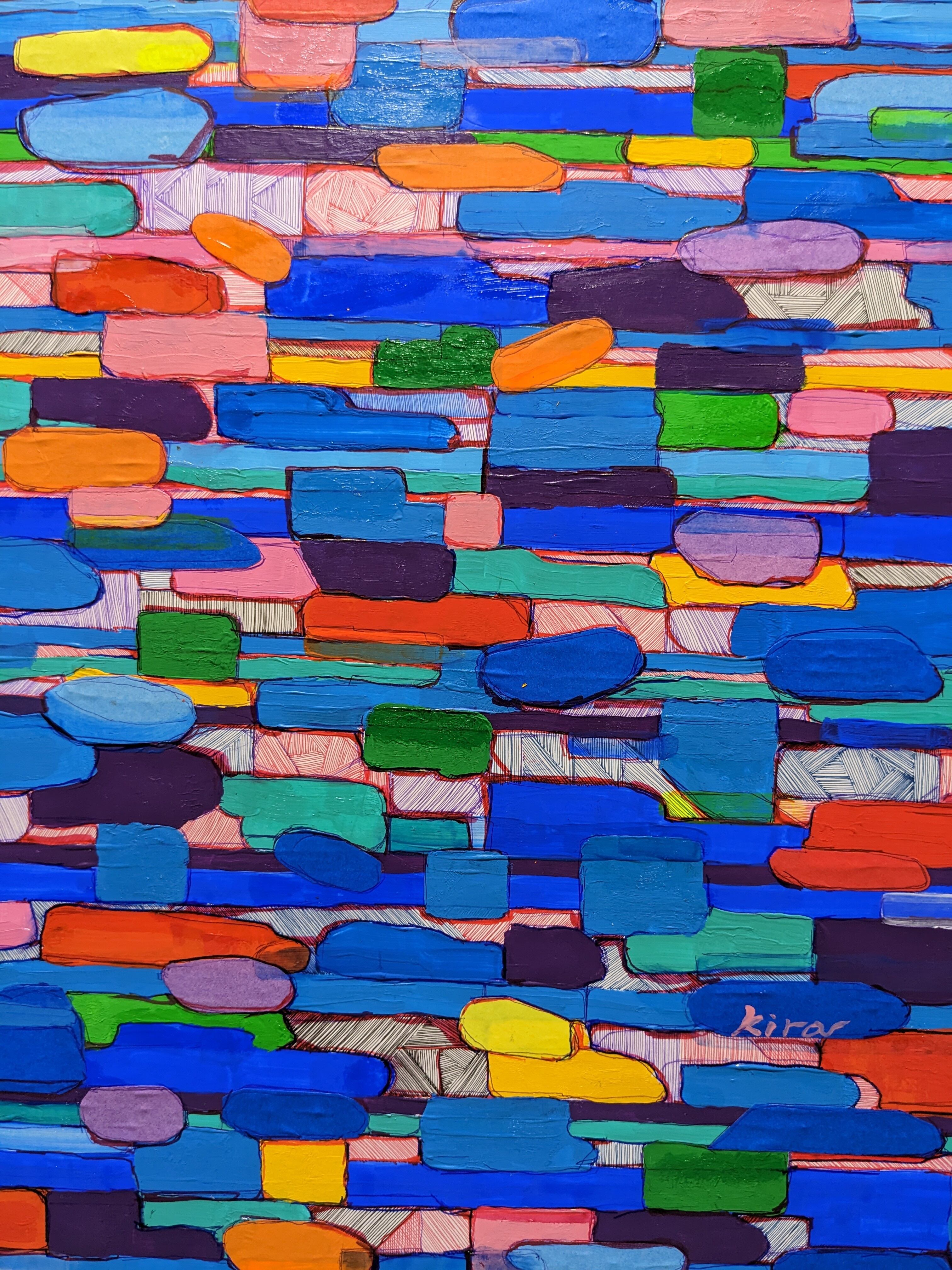 力強い色彩が鮮やかに交錯するボーダーのデザインが特徴的な作品です。この作品は、見る人に新たな視覚的体験をもたらし、それぞれの色の持つメッセージを感じ取ることが出来ます。ボーダーが織り成す独特なリズムは、視線を引きつけ、心に響くことを願っています。