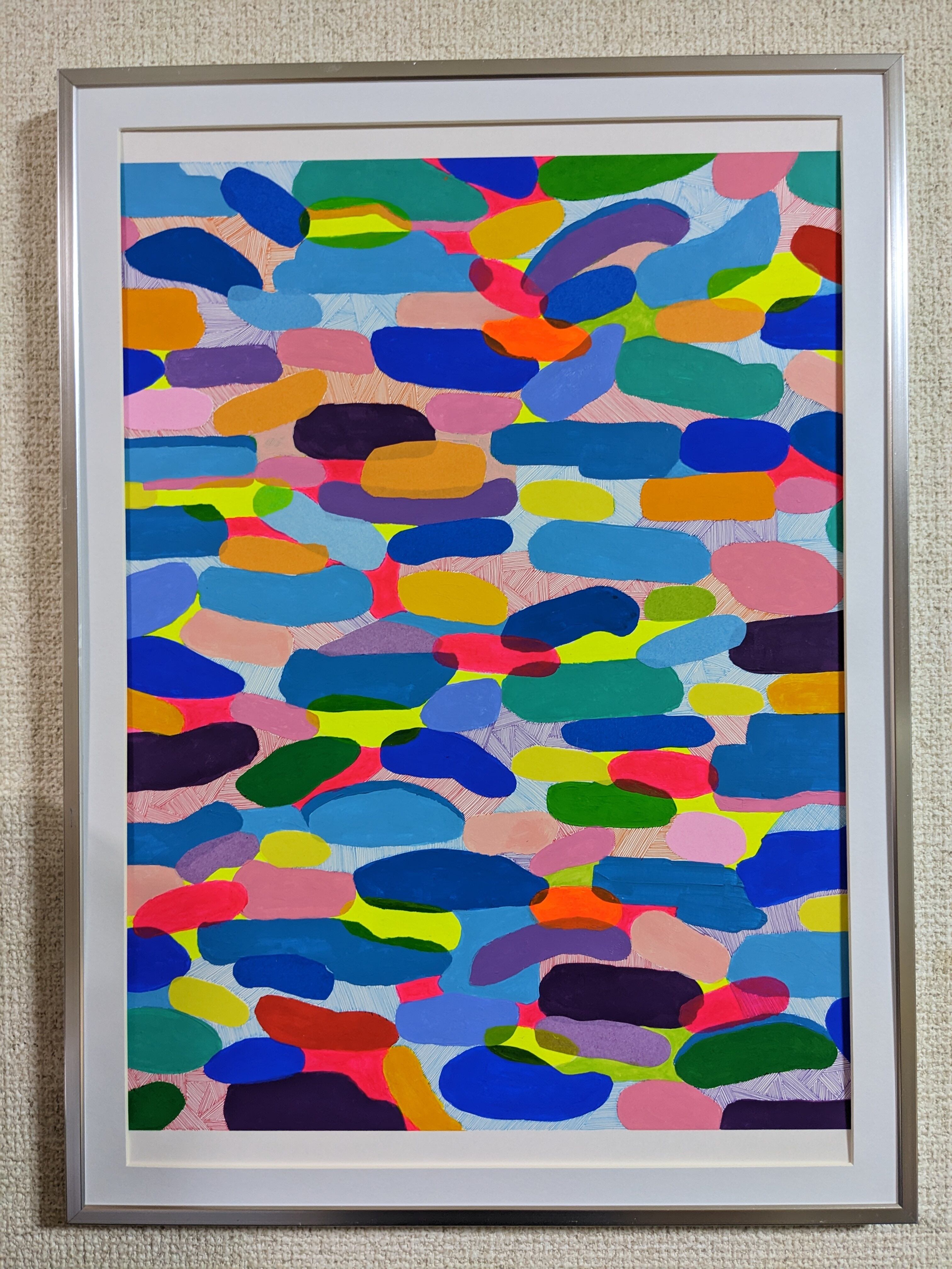 人々の個性が美しく織り交ぜられた抽象画です。色と形の調和が、違いを尊重しながらも協調性を生み出す様子を描いています。