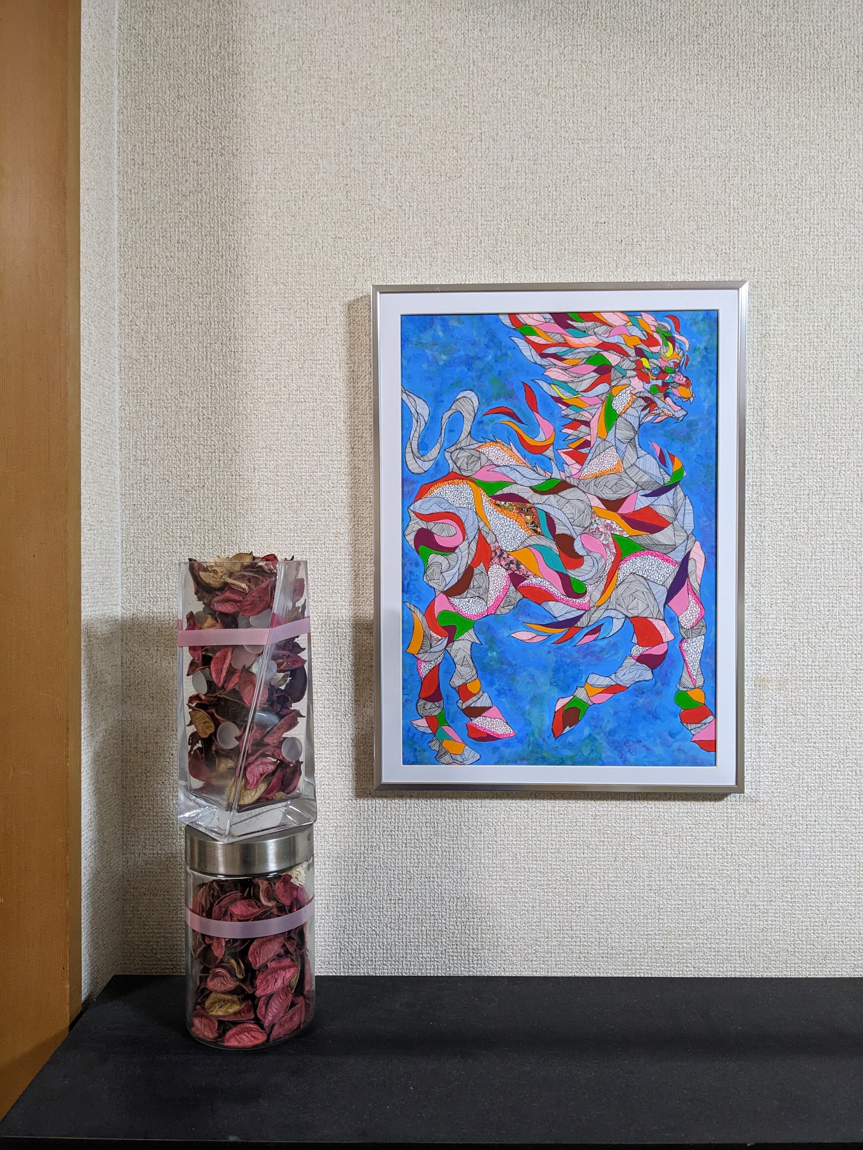 神秘的な存在「麒麟」。この作品は、優雅な線の一体感と力強い色使いによって、生命感あふれる麒麟の姿を鮮やかに表現しました。この麒麟を通じて、古来からの日本の神秘を感じ、新たなエネルギーを受け取っていただけると思います。