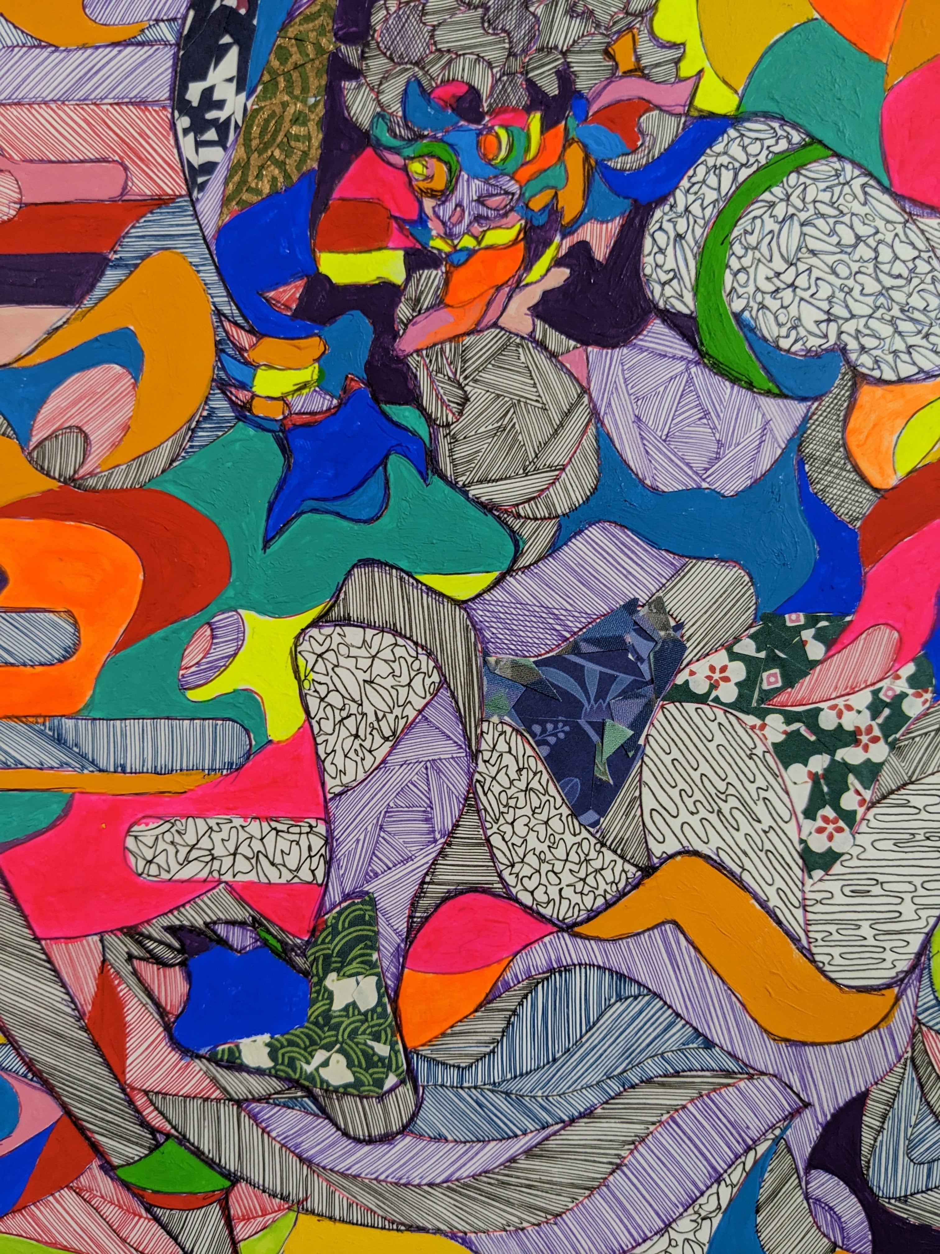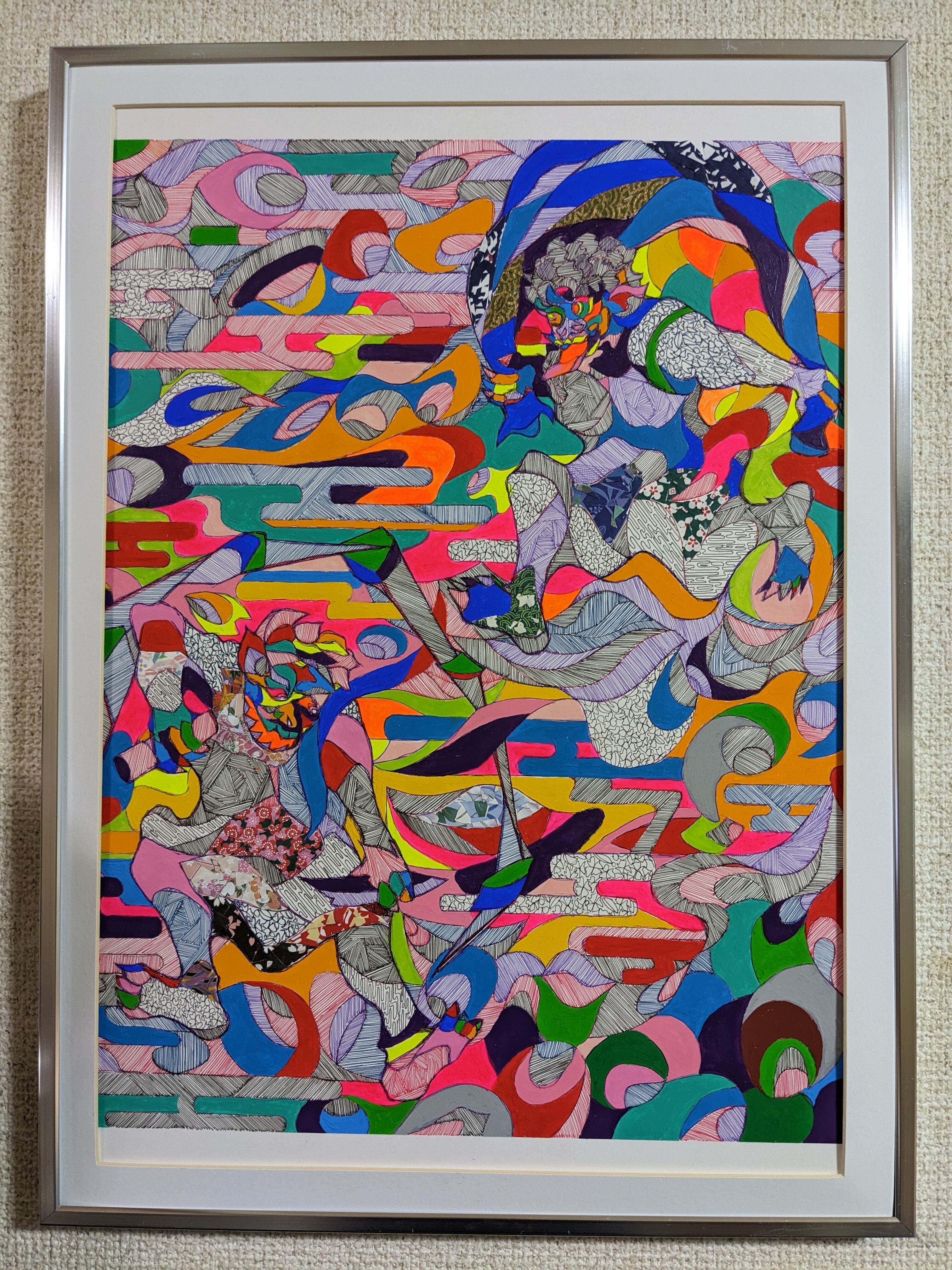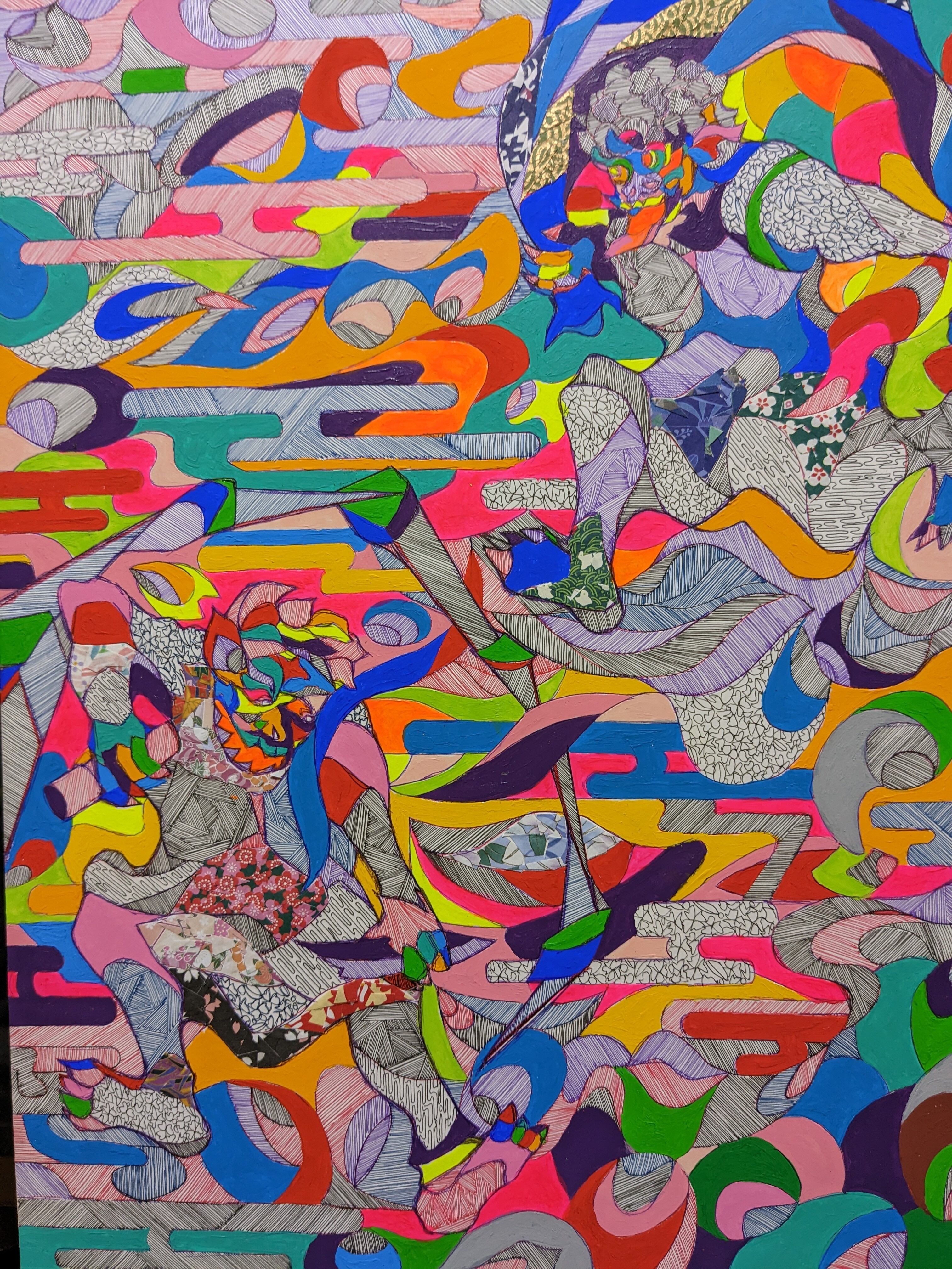 重なり合う色彩と無数の線は、思考・感情・記憶といった人間の内的世界の層を可視化したものであり、その中から、仏性を宿す存在が静かに浮かび上がるよう表現しました。
