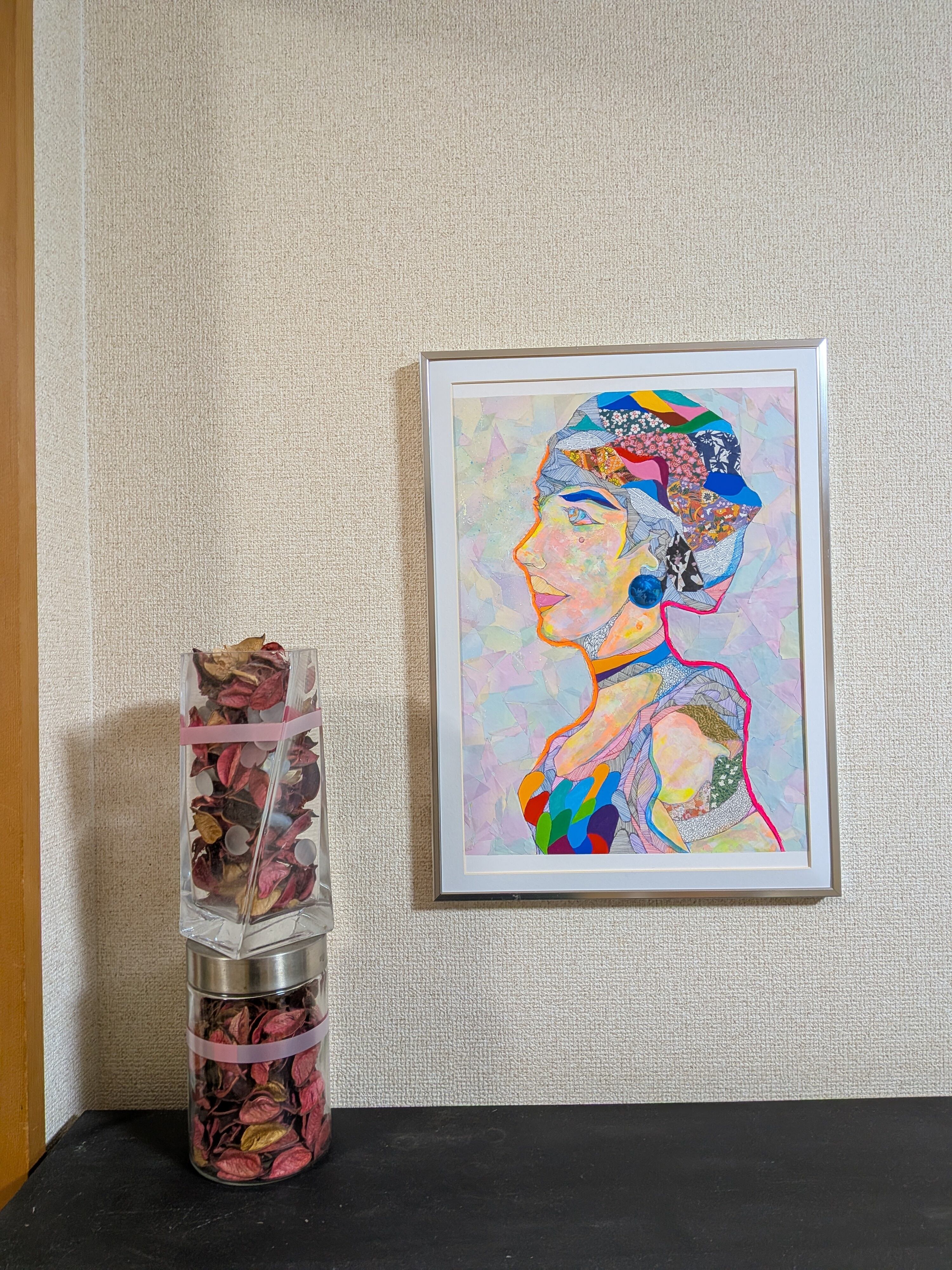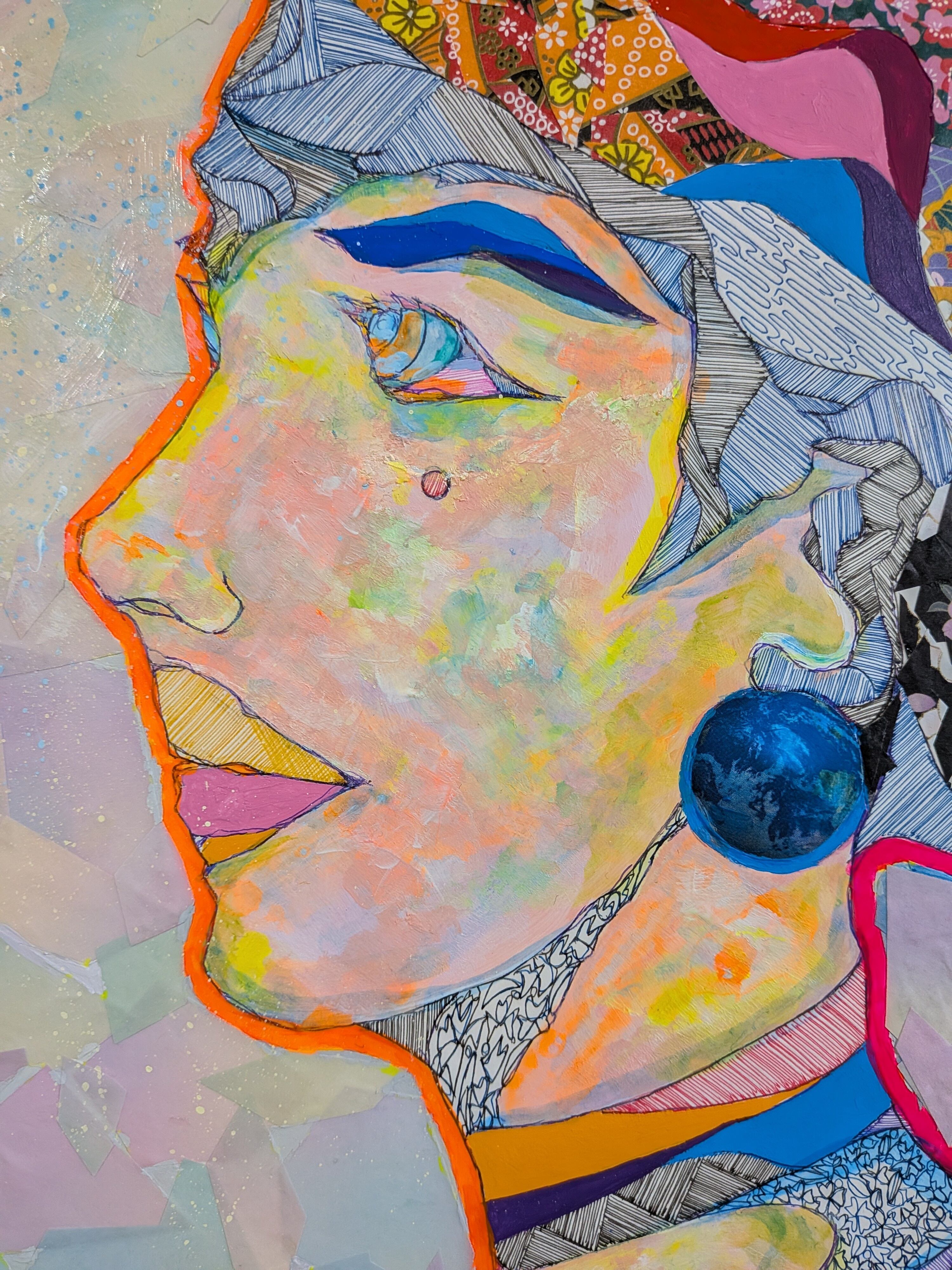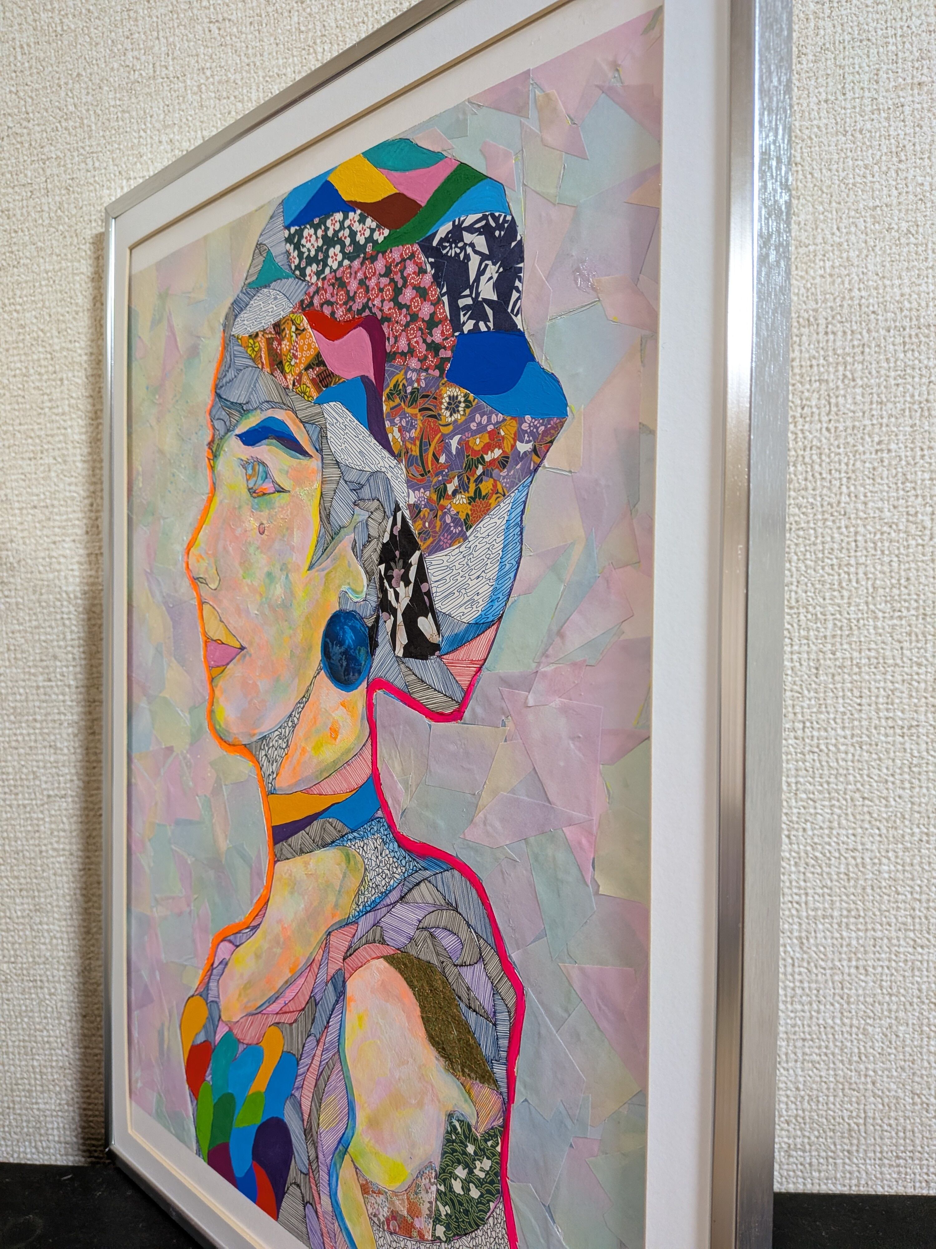 顔や身体は、鮮やかな色彩と異なる文様の断片によって構成され、