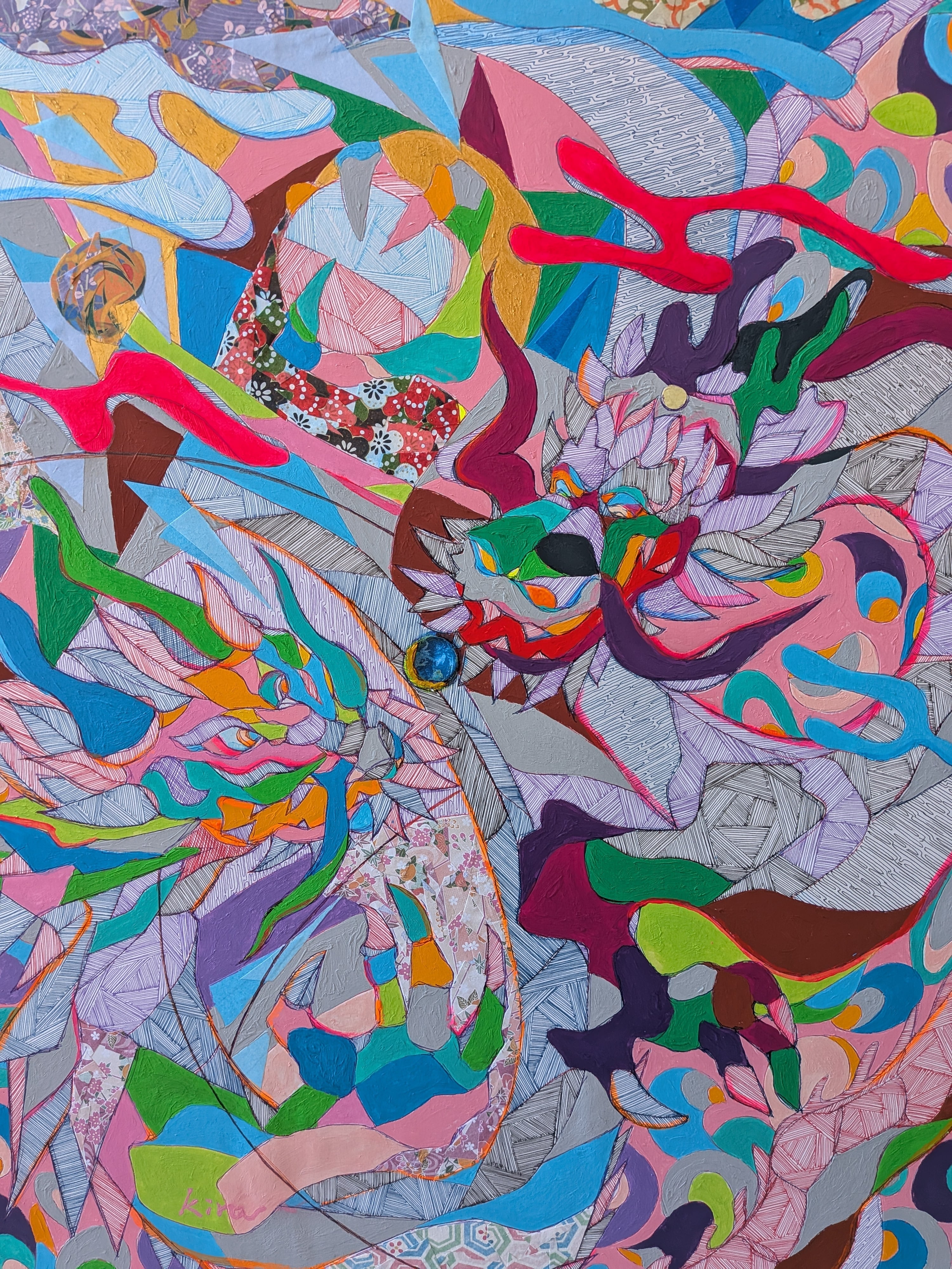 この作品は、2つの存在がぶつかり合いながらも、ひとつの流れの中でつながっている様子を表しています。