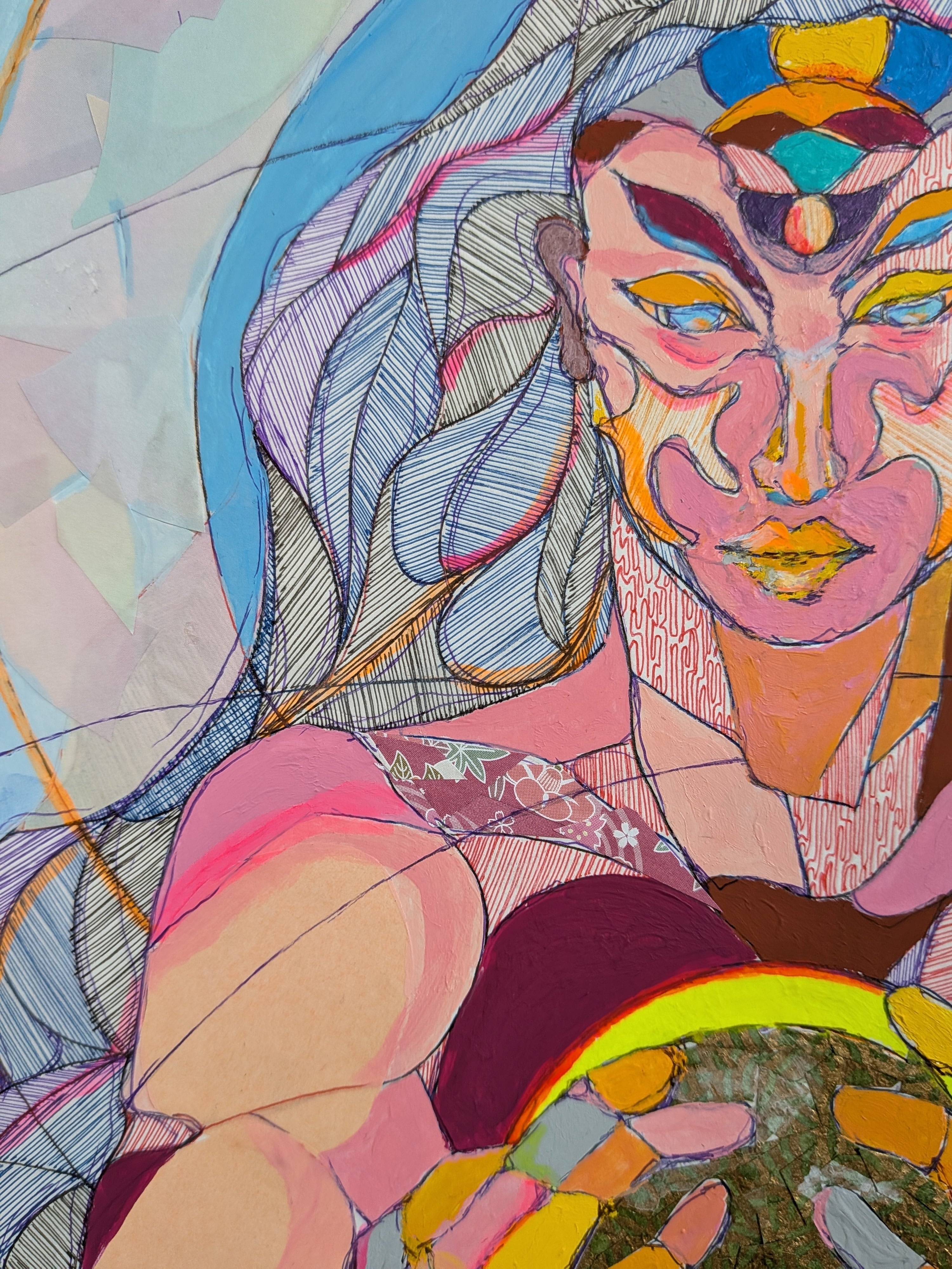 顔や体はさまざまな色や形で描かれており、人の中にあるいろいろな感情や経験を表しています。