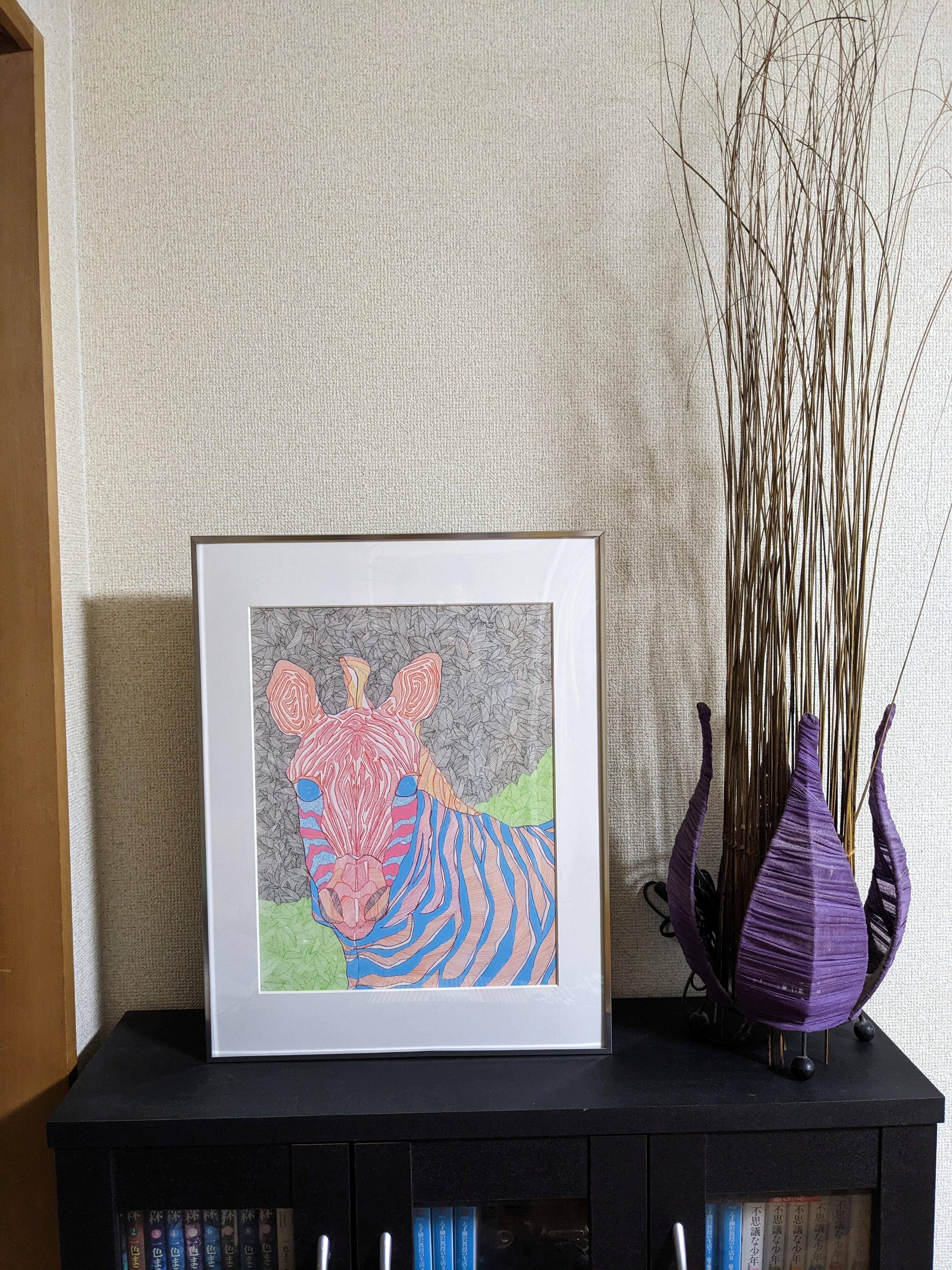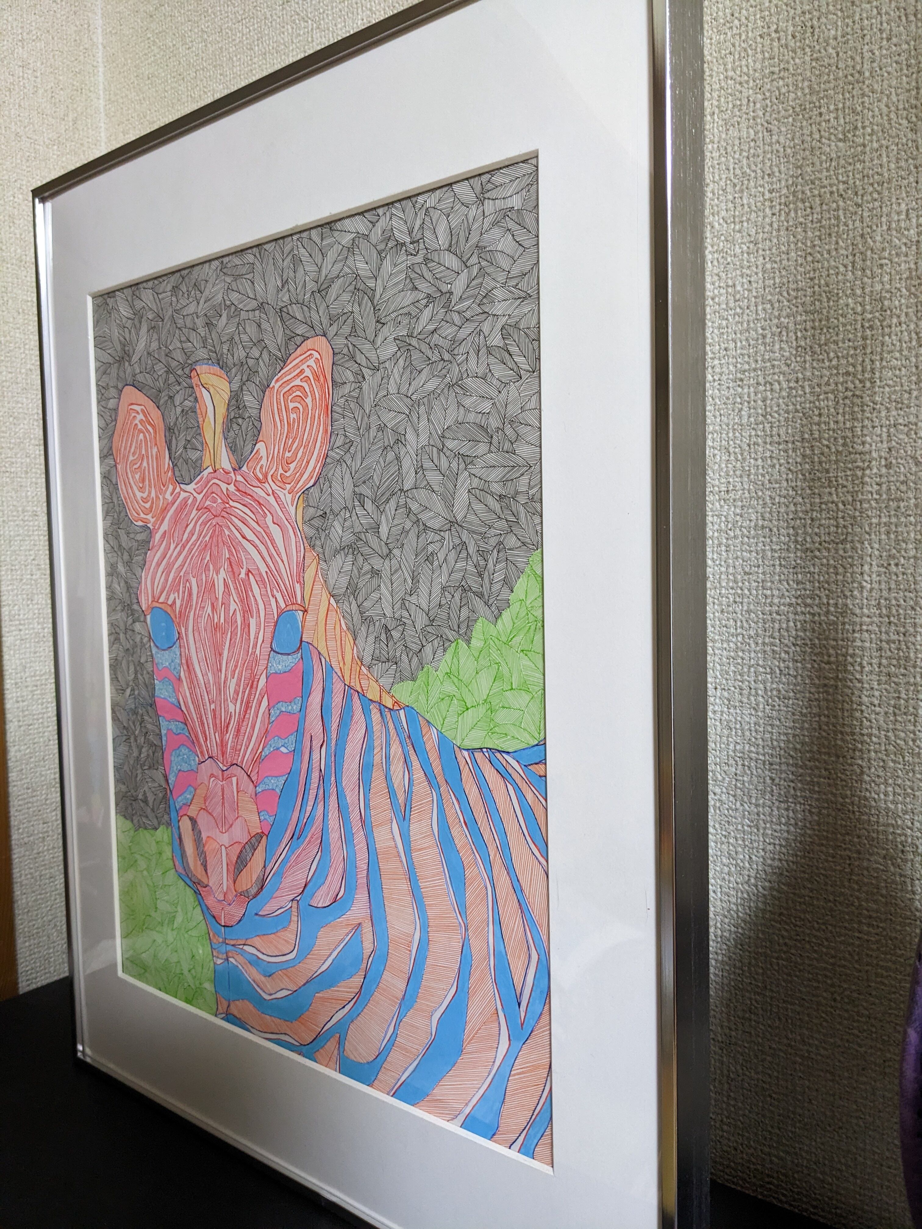 生き生きとしたしまうまの表情がキュートな、アクリル画の「シマシマ」。丁寧に手描きされた0.28mmのボールペンで描かれた、しっかりとした線画が特徴です。