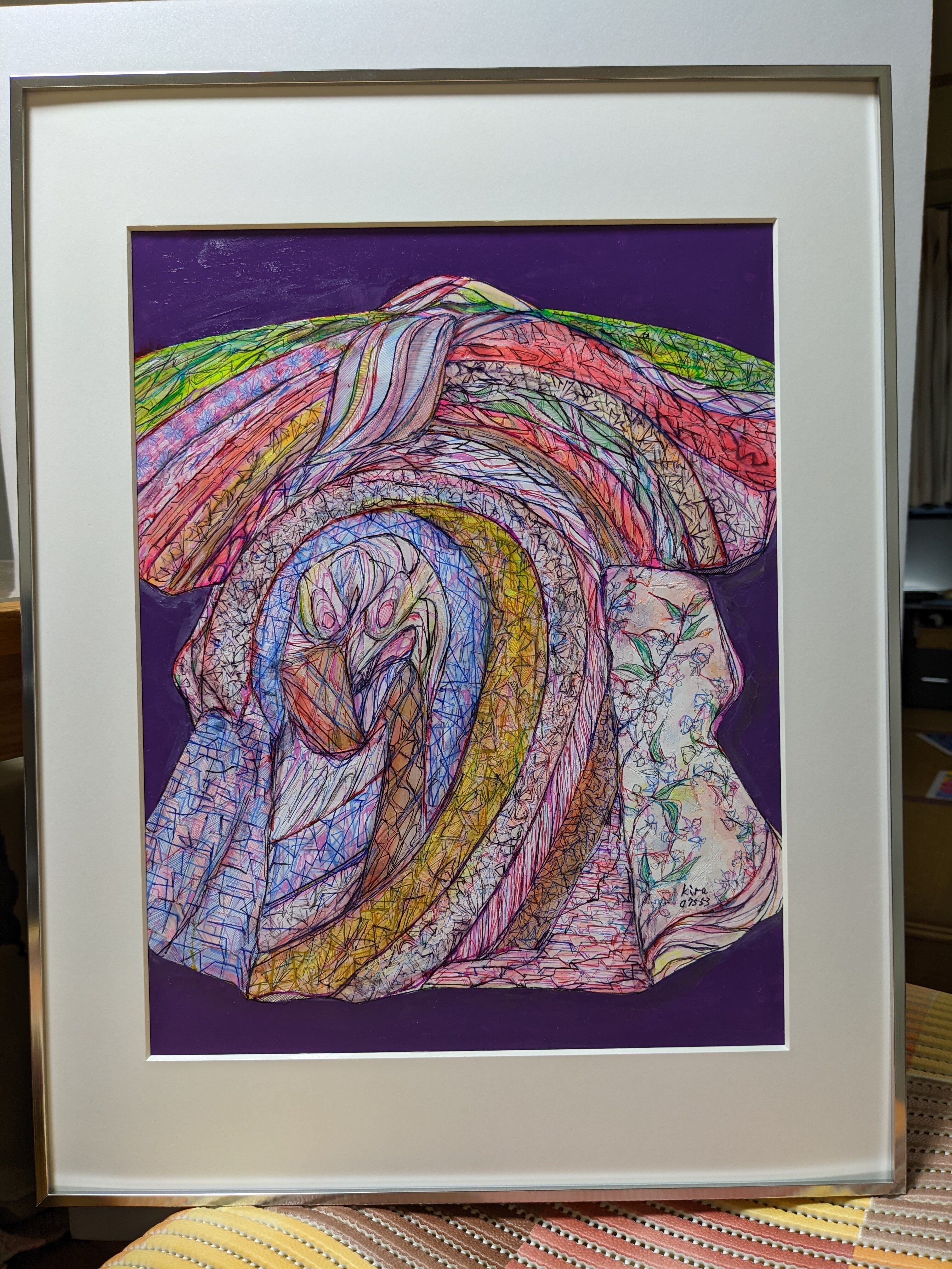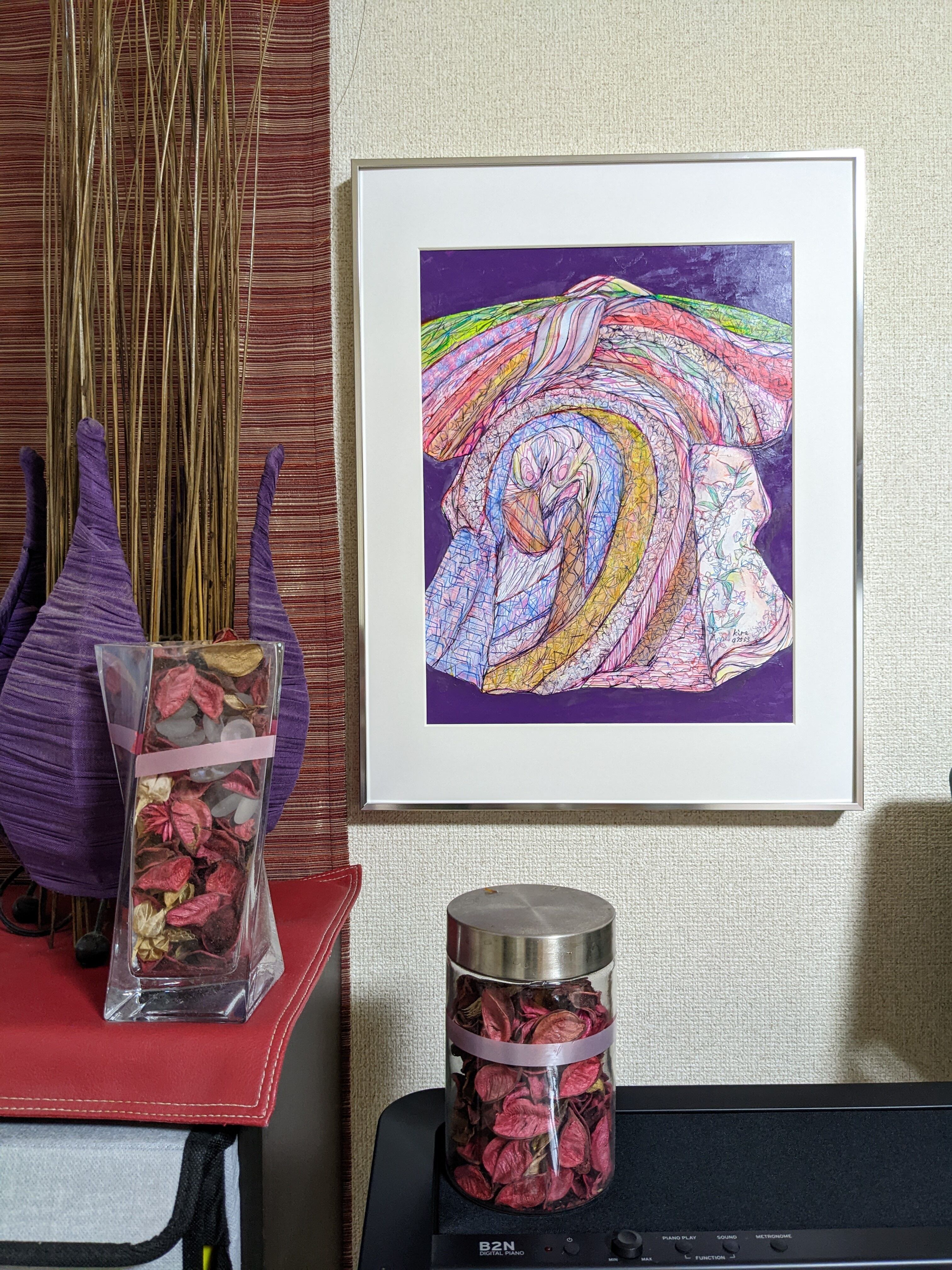 「kimono」は、アーティスティックなデザインが魅力的な一枚です。アクリルと0.28mmのボールペンを使って、着物を抽象的に描いた独特のデザインが、どこかエキゾチックで目を引きます。