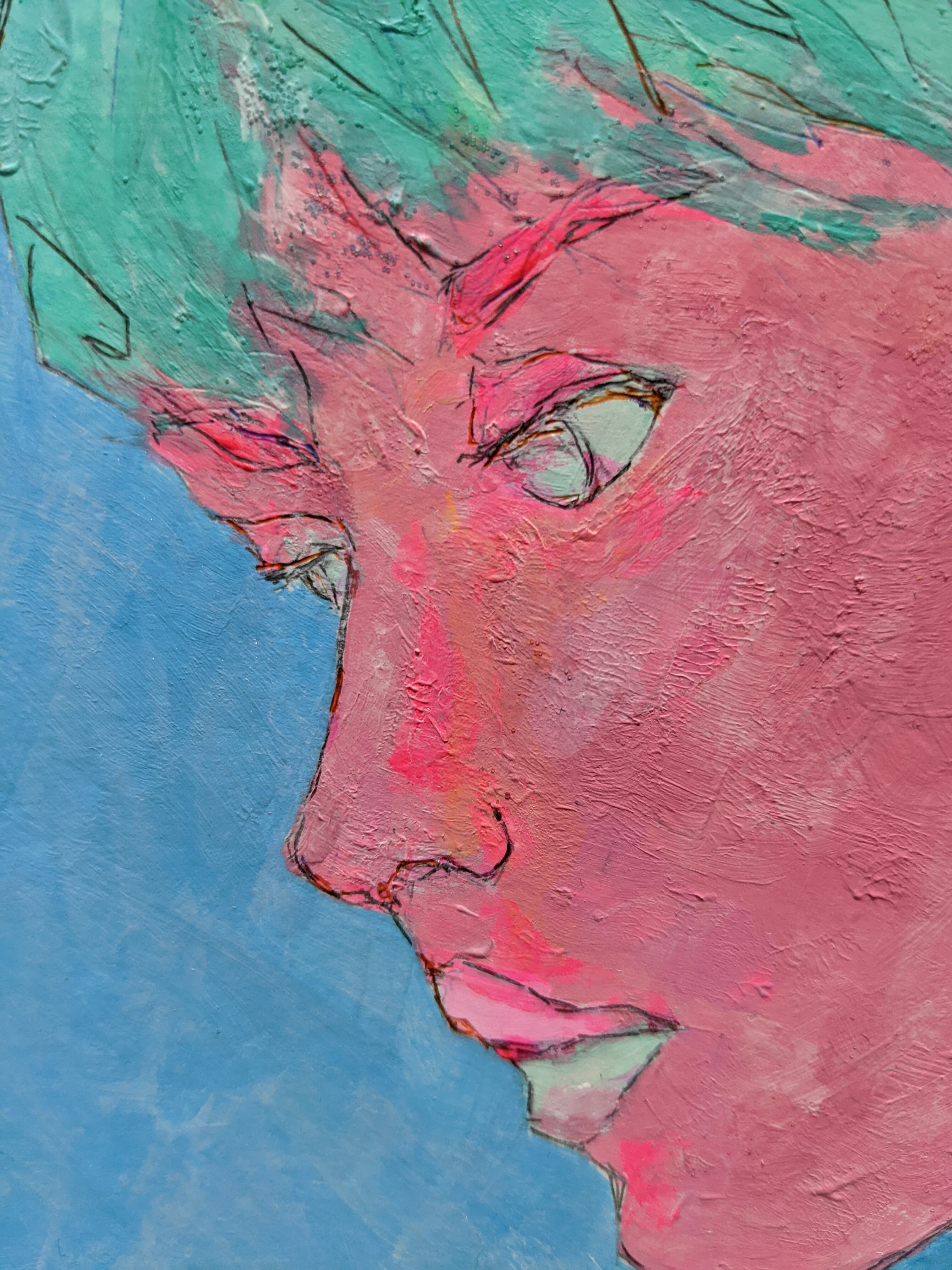 thinkというタイトルが示す通り、このアクリル画は深く考える時間を過ごす女性を描いたものです。着物姿の女性が居間に座り、窓から差し込む光に照らされながら、自分自身や人生について考えを巡らせています。
