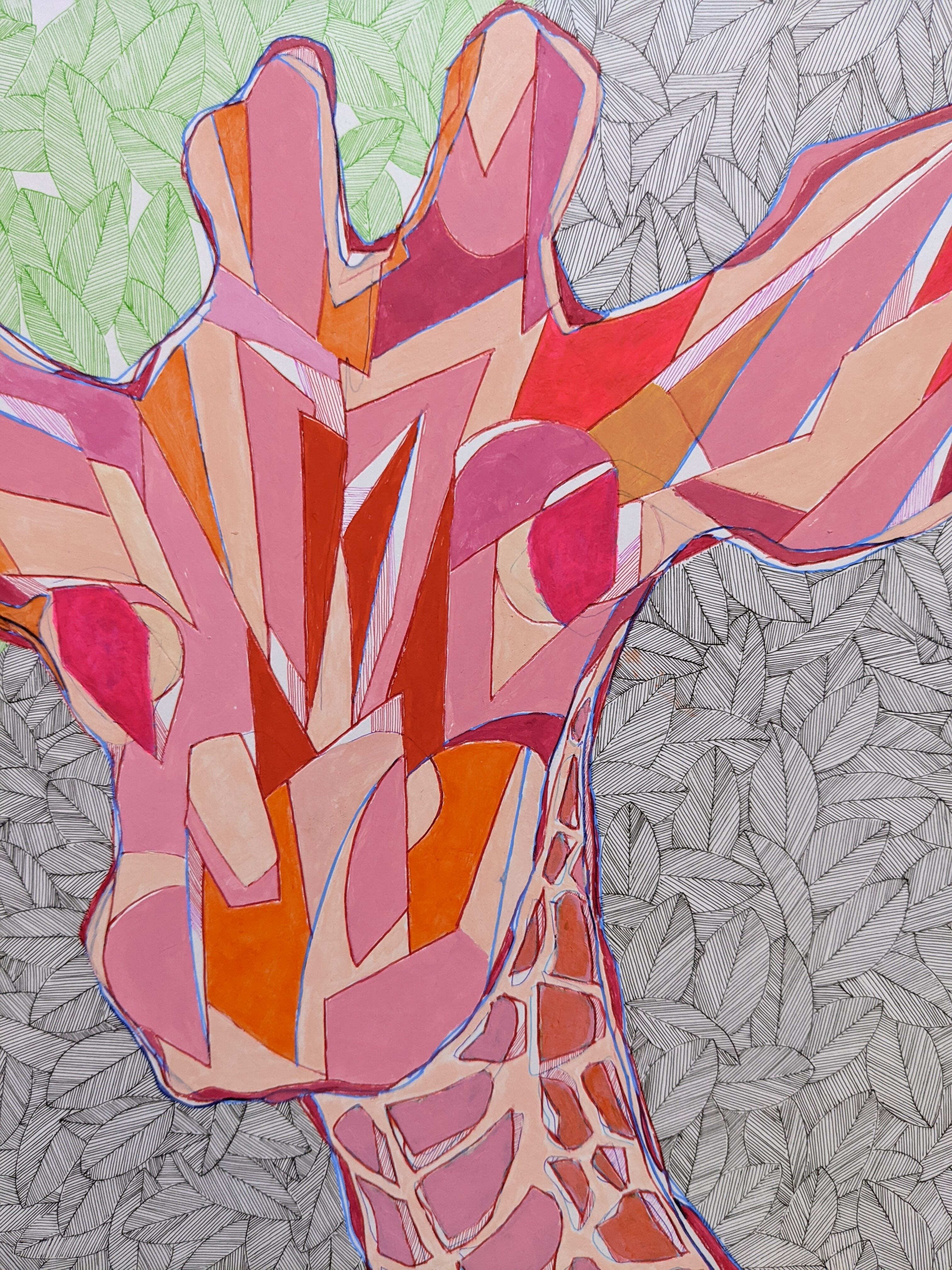 「キリン H」は、美しいアクリル画が描かれた壁掛けアートです。葉に囲まれたキリンの姿が、優雅で力強い印象を与えます。