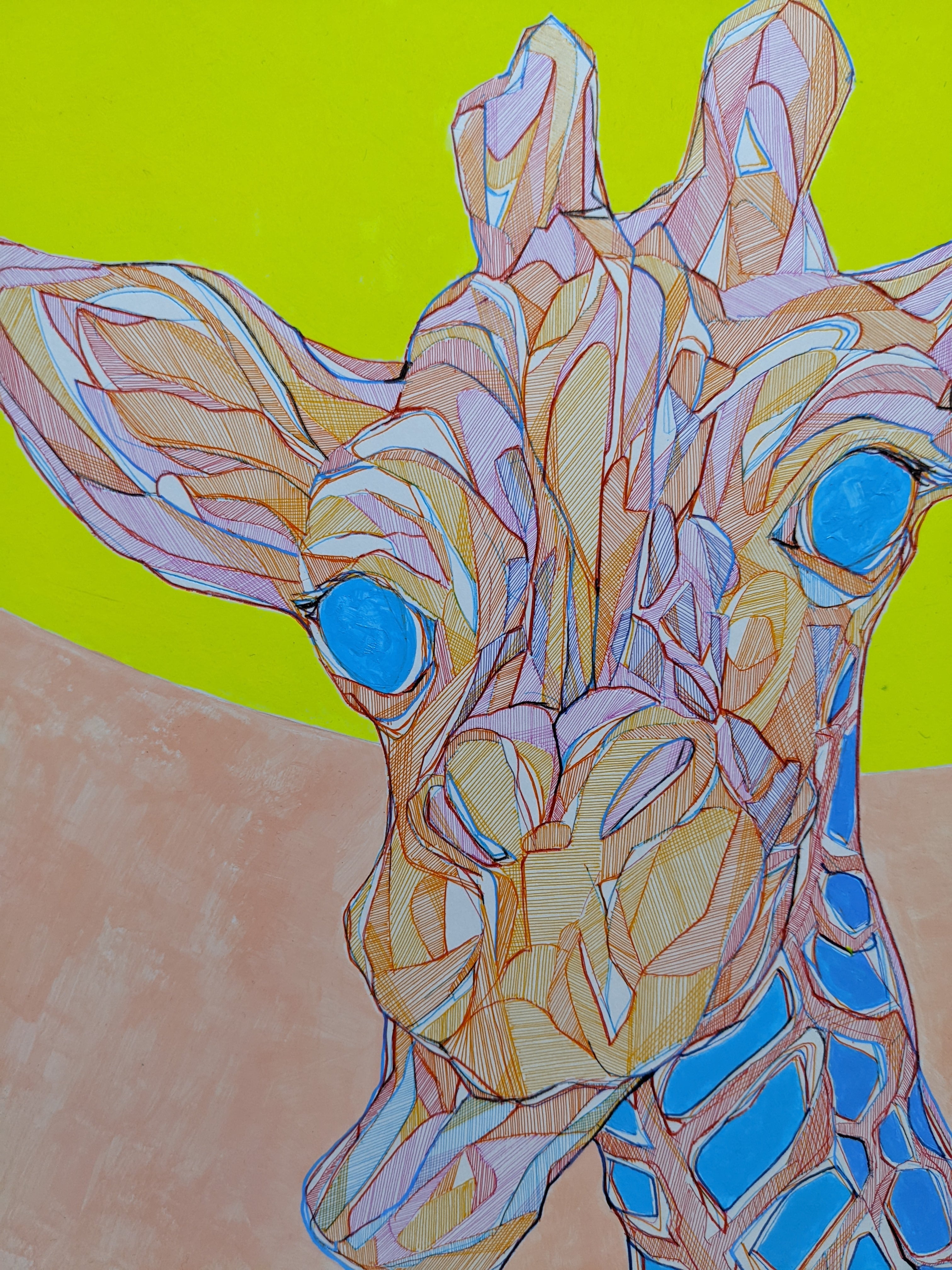 「キリン Y」は、大自然の中で自由自在に生きる姿に憧れを抱かせる、美しく繊細なアクリル画です。