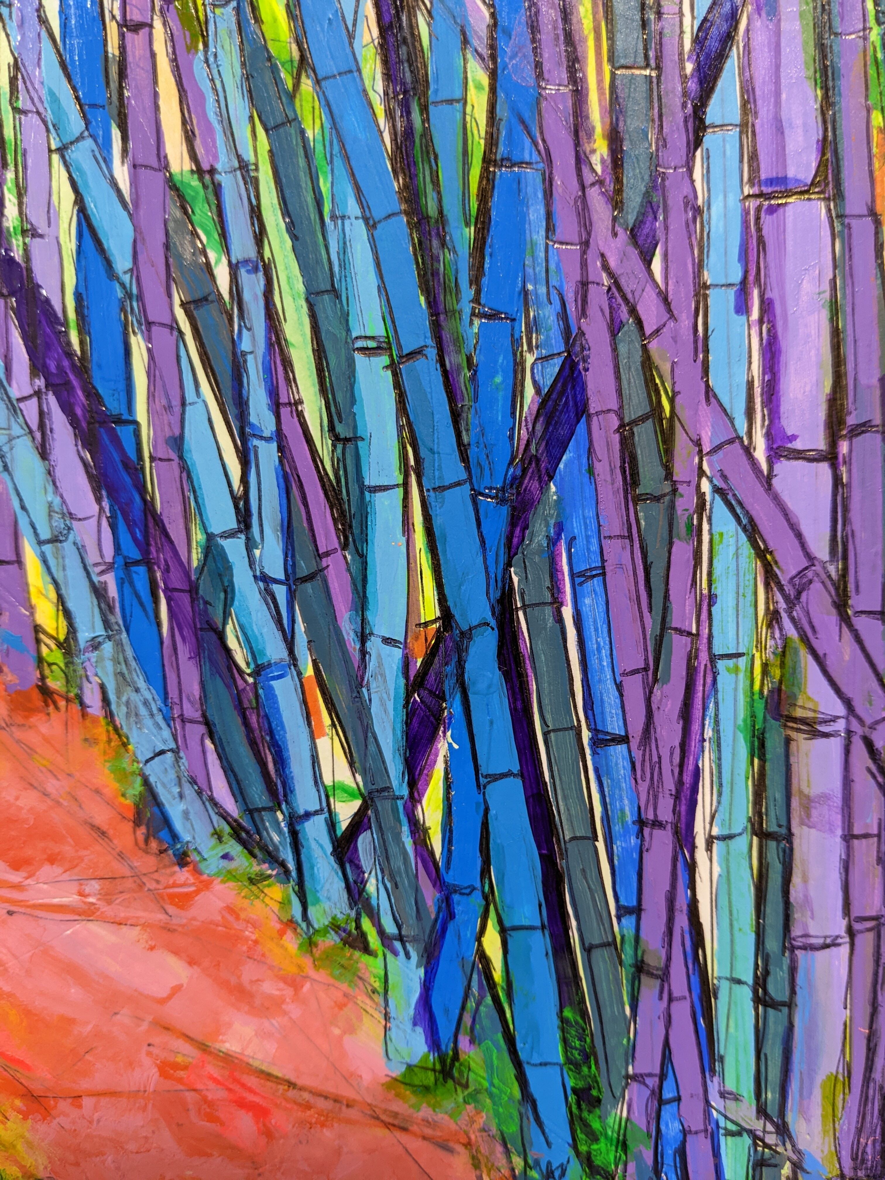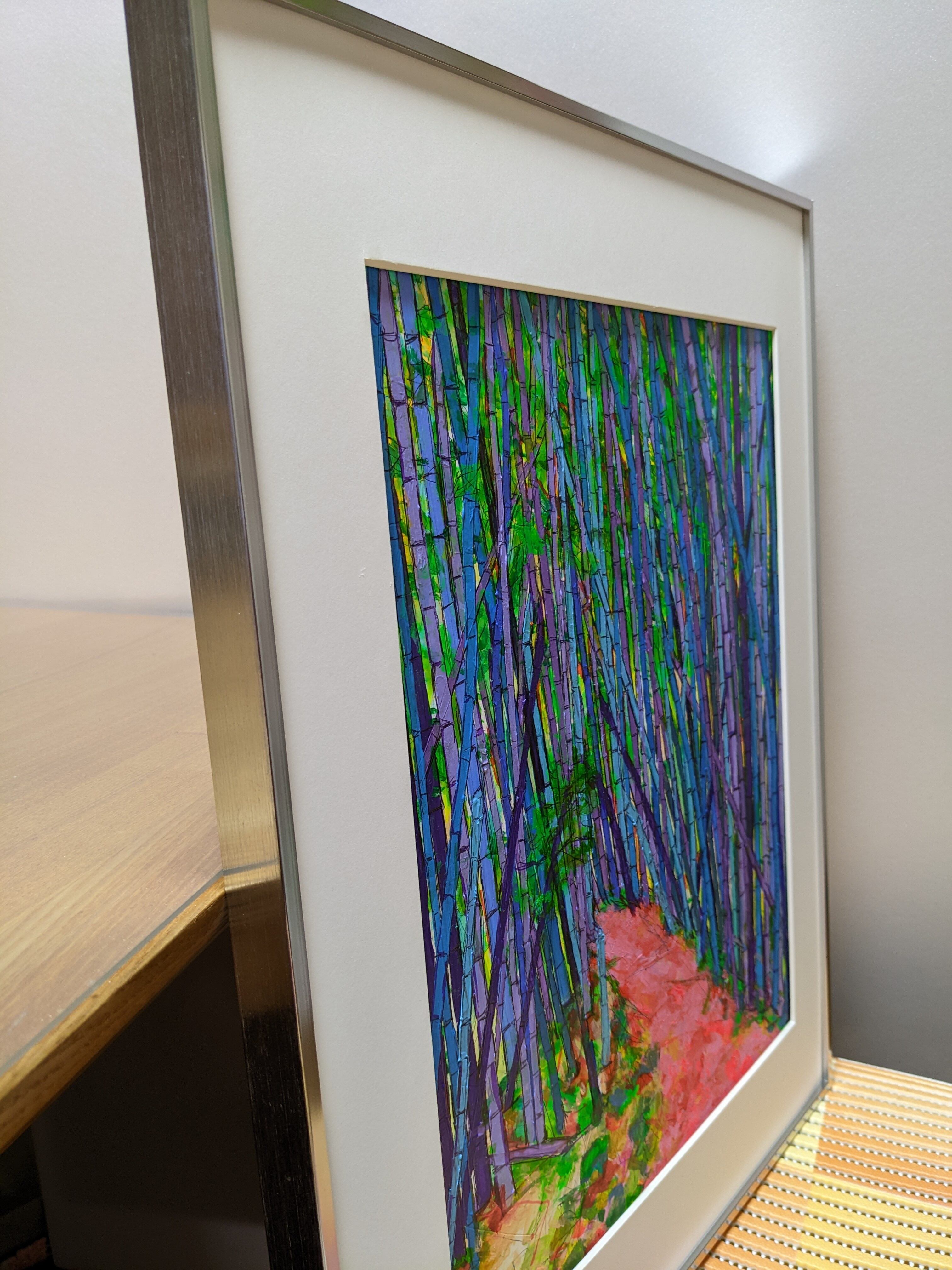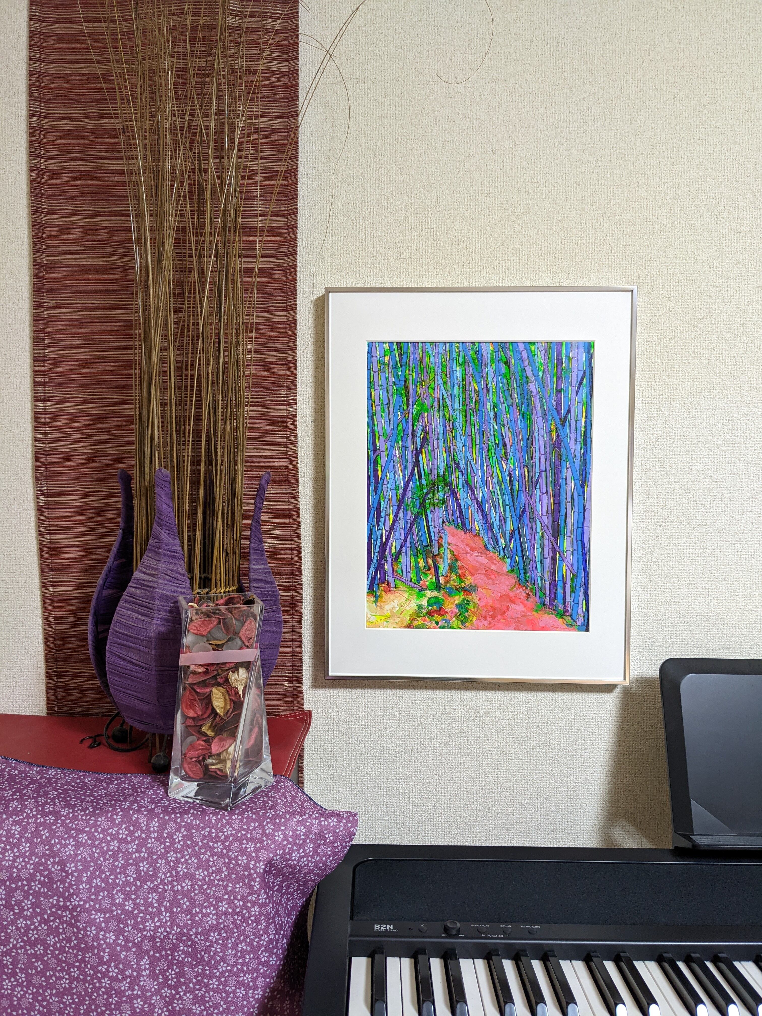 竹林を描いた抽象画「竹林」。青と赤を基調とした色使いが、ナチュラルで和を感じさせます。竹の節や、風による蕎麦打ちのような筆使いなど、大胆なタッチの中にも細部までこだわり抜いた作品です。