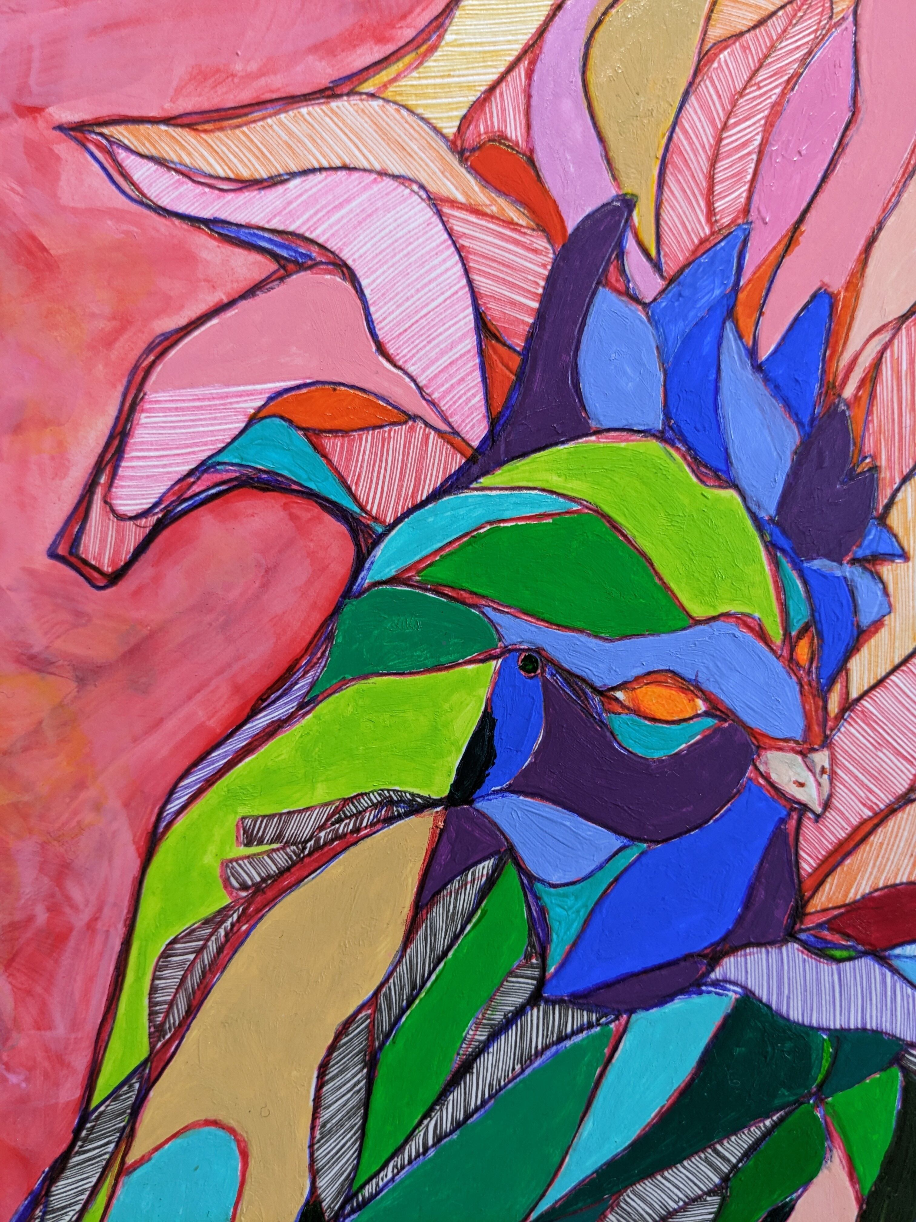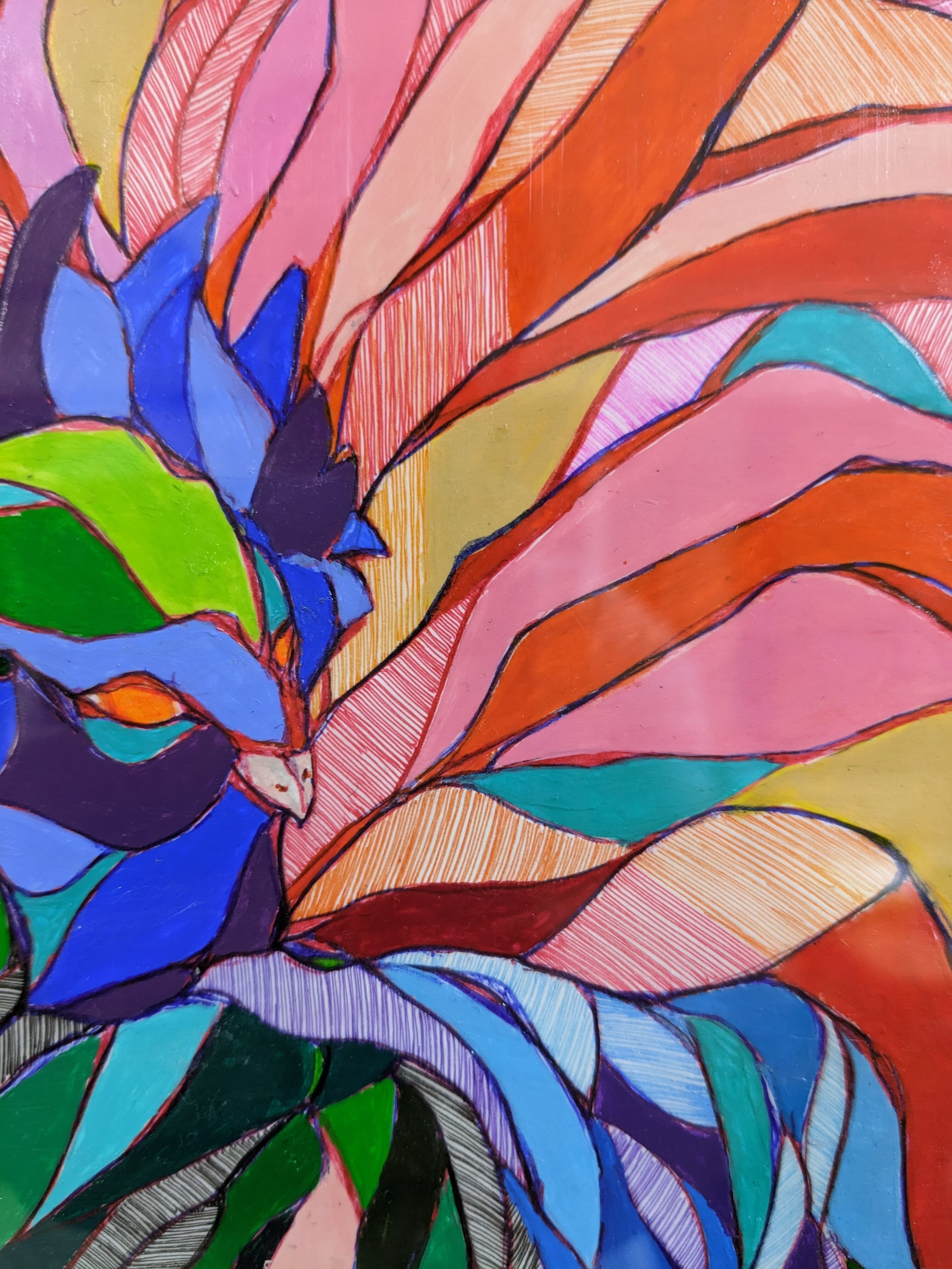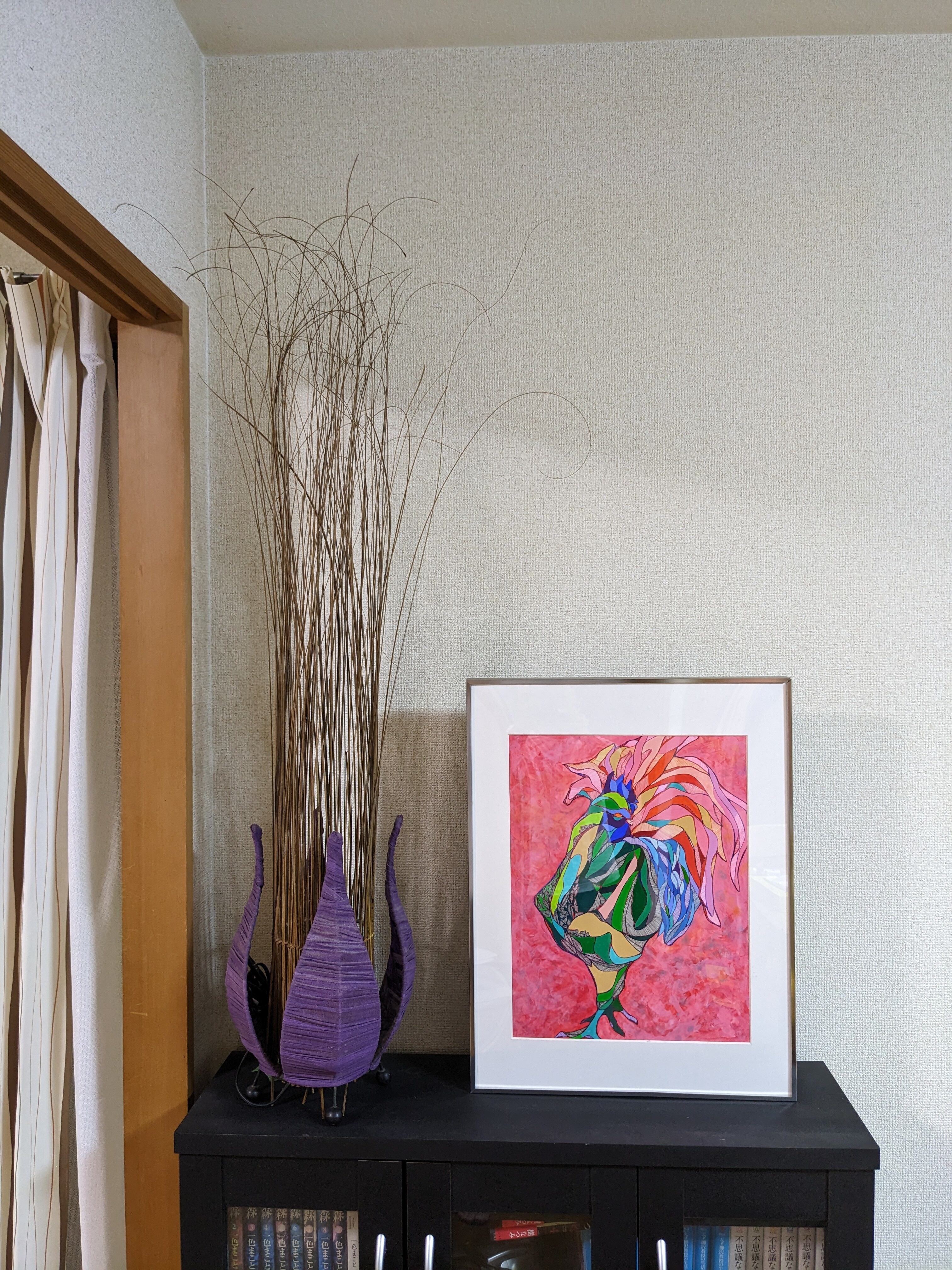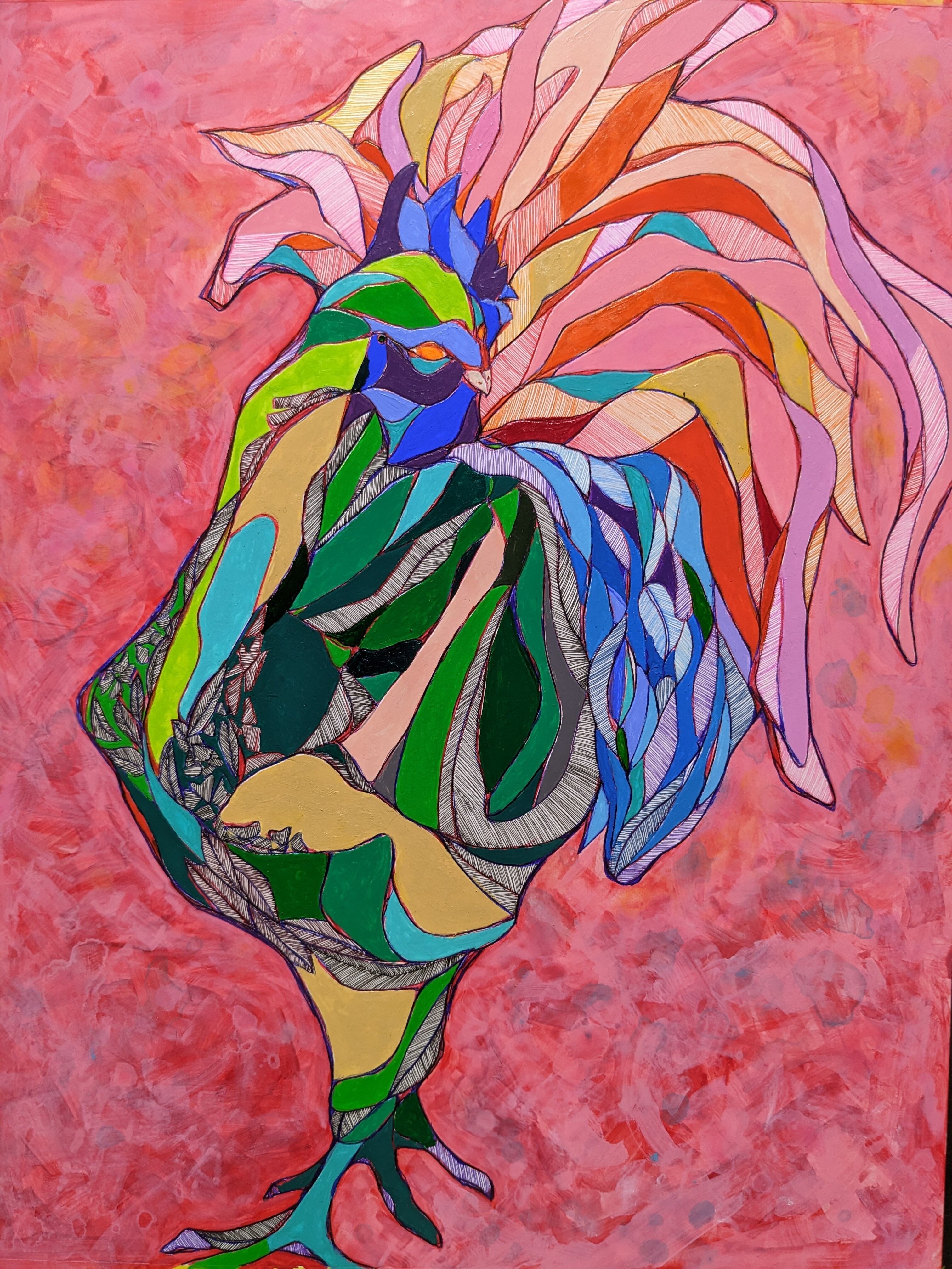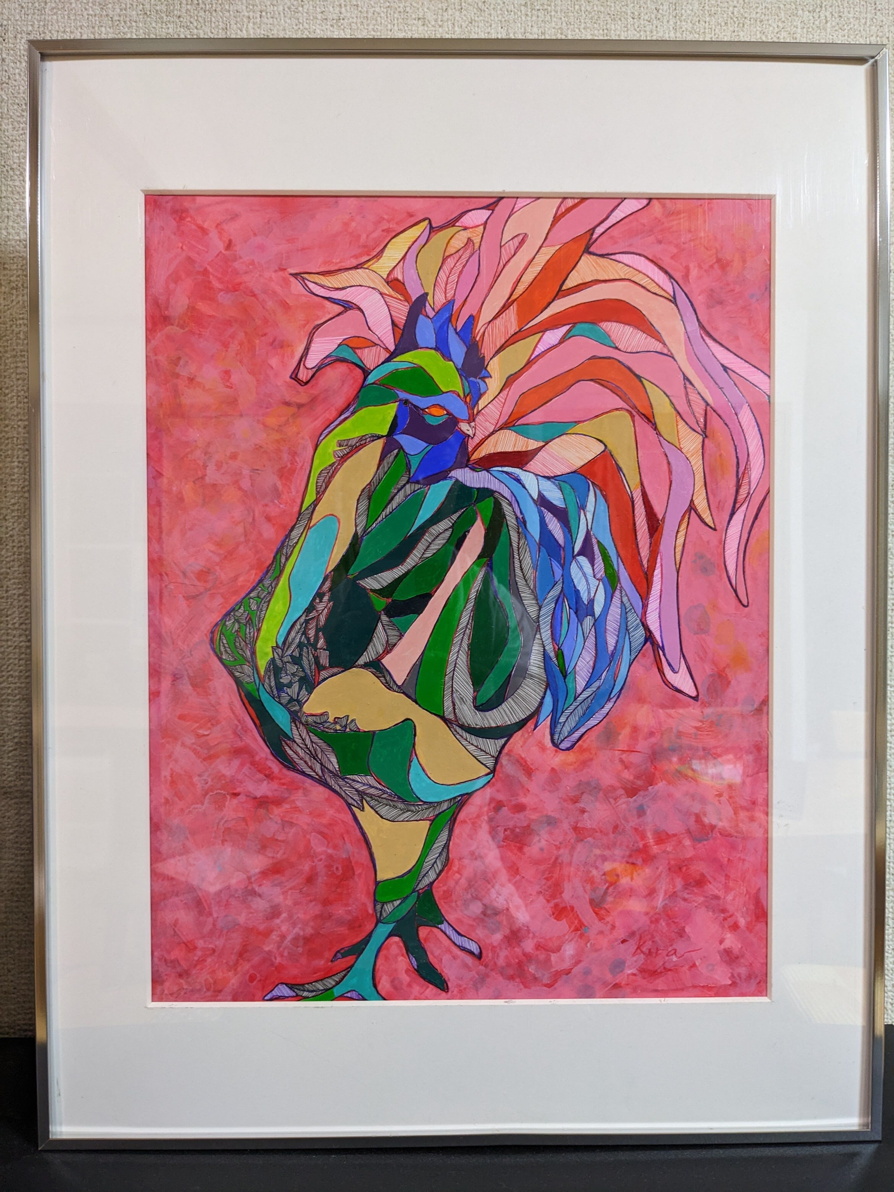 鮮やかな色合いで描かれた、自信に満ちた鶏の絵が特徴のflaunt。このアイテムは、あなたの個性や自己表現を誇示するために生まれた一枚です。力強く威風堂々とした鶏の姿は、勇気や自己主張の象徴でもあります。