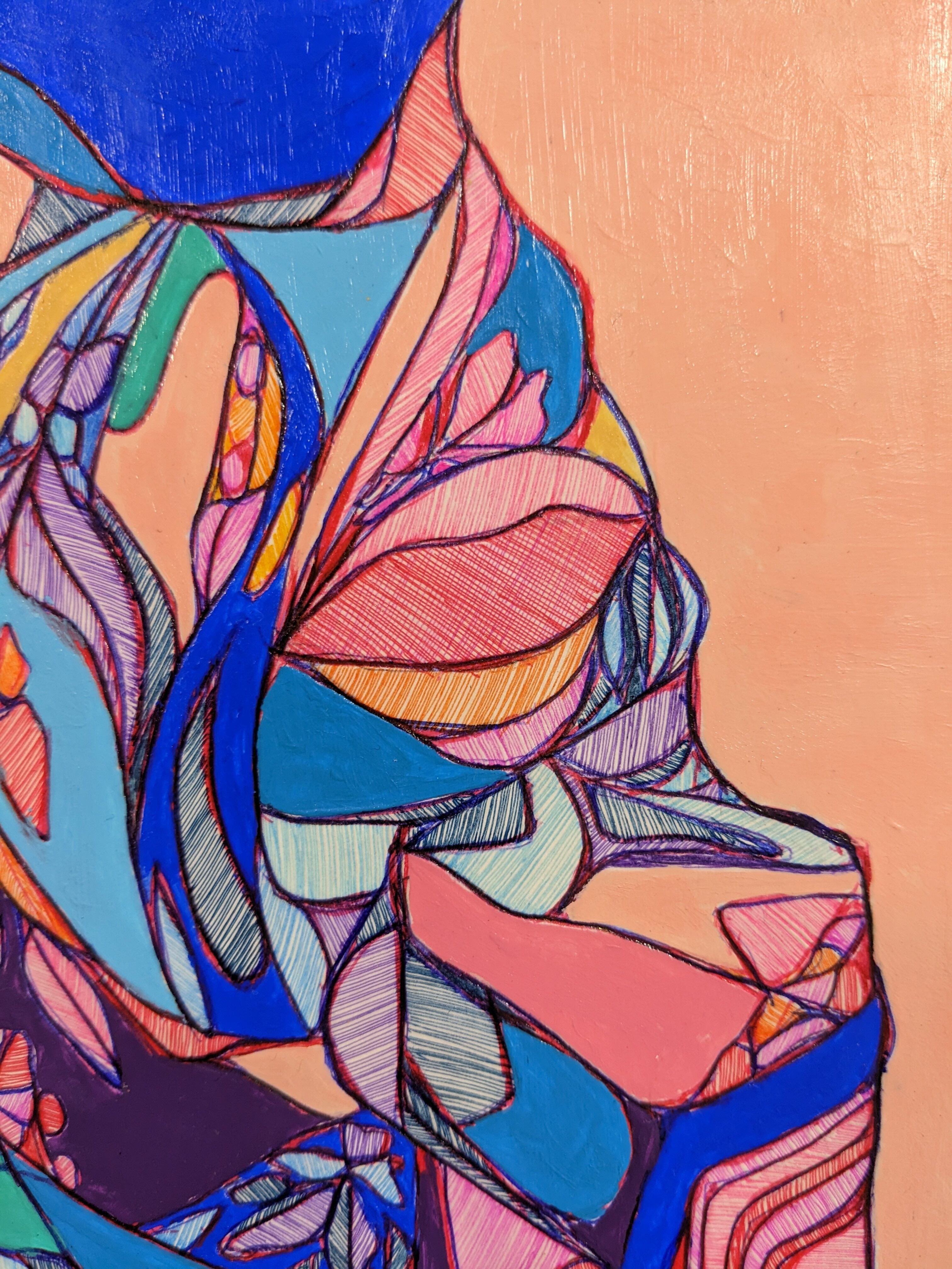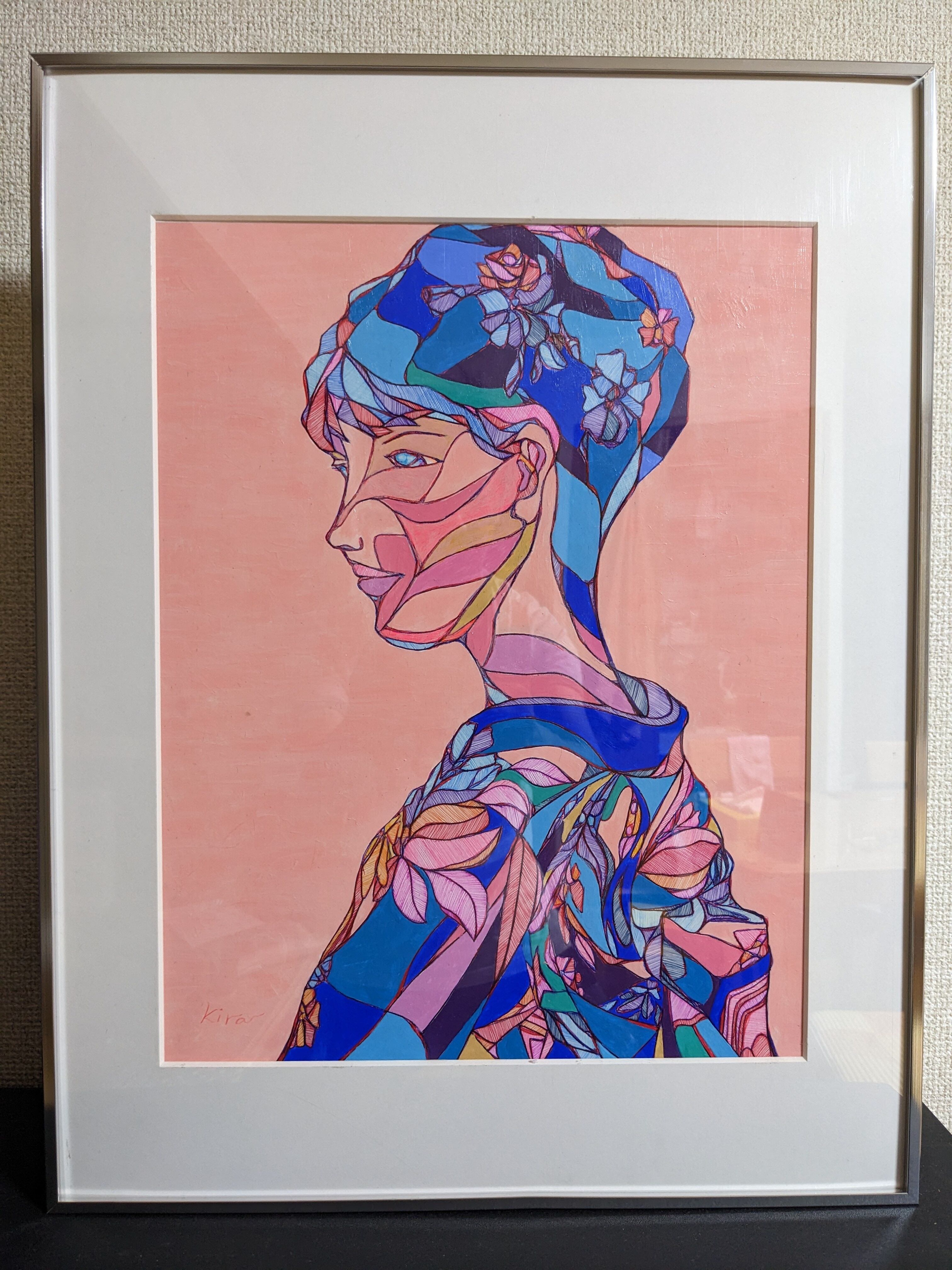 優雅な雰囲気漂う着物をお探しの方におすすめの「kimono b」です。美しい青い着物を着た女性の絵が描かれており、和の風情を感じさせる一枚です。日本文化に興味をお持ちの方や特別な場に華やかさを加えたい方にぴったりのアイテムです